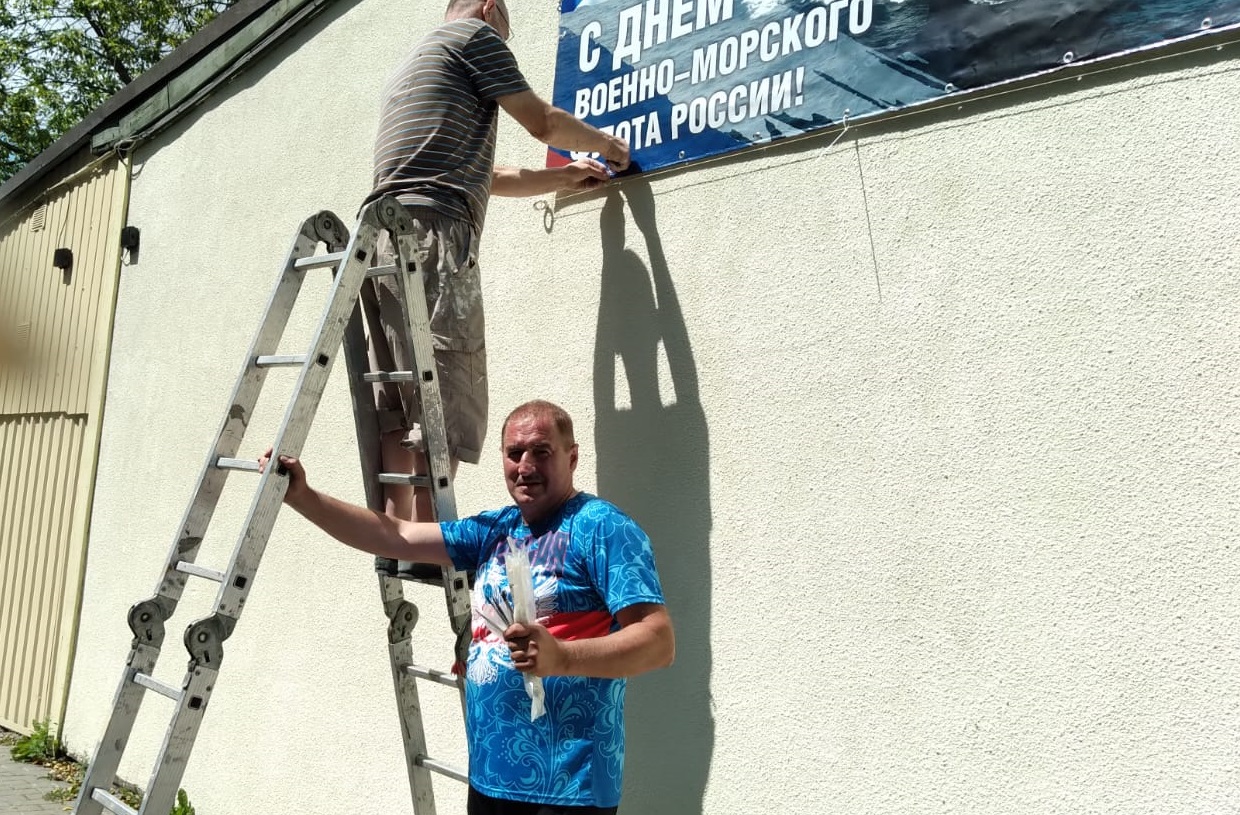 Накануне Дня ВМФ красочные плакаты украсили штаб городского отделения партии и подъезды домов