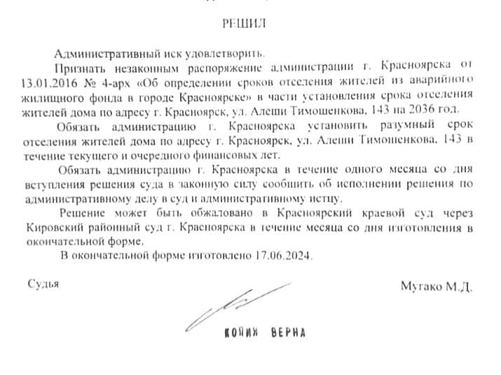 «В суде доводы администрации о переезде жителей в помещения маневренного фонда, расположенного в Октябрьском районе, в 10-15 км от места проживания, признали несостоятельными. Во-первых, проживание в течение 12 лет до 2036 года далеко не временное. Во-вторых, переезд на столь значительное расстояние повлечет за собой потерю социальных связей – детям придётся переходить в другую школу, садик и так далее. Администрация города теперь обязана выполнить решения суда и расселить дом в разумные сроки», — рассказал Семён Сендерский.