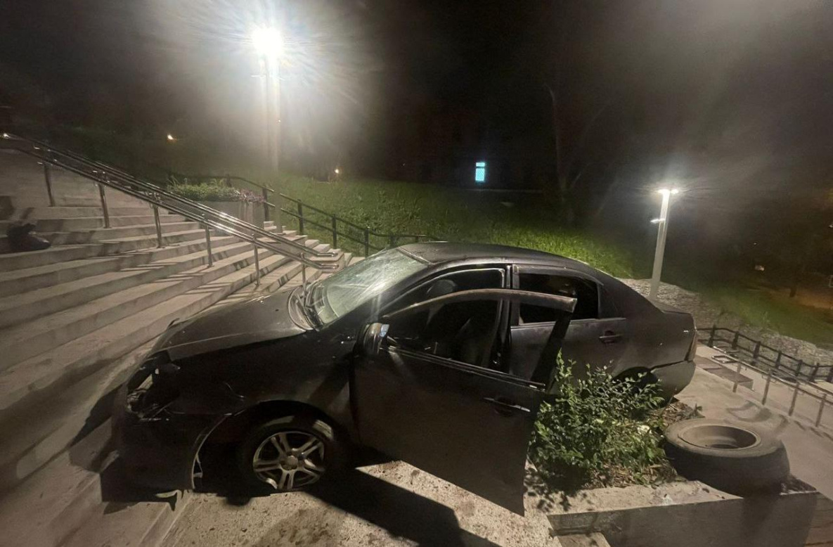 Молодой человек без водительского удостоверения вылетел среди ночи на своём авто прямиком с лестницы. Слава богу без жертв