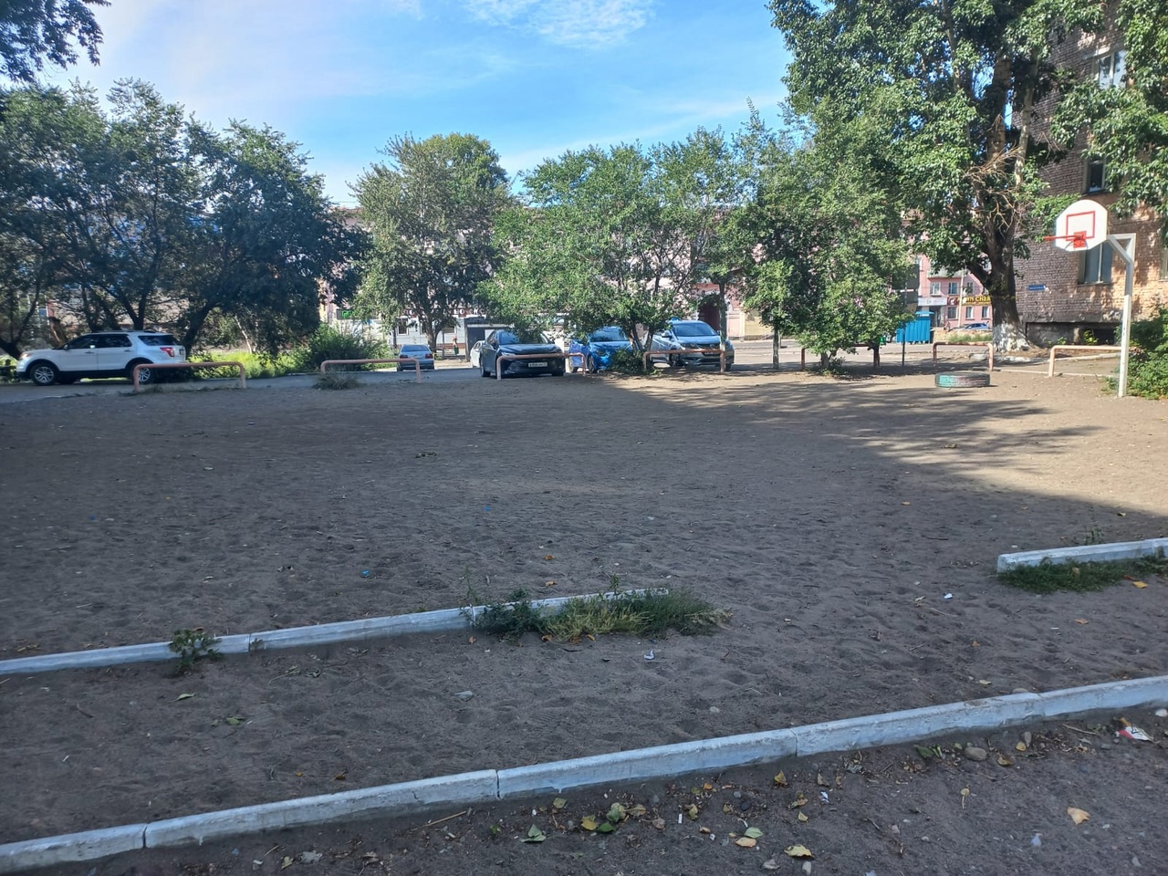 Пока стоит только информационный щит, как напоминание о несбывшихся мечтах детей и их родителей: нет ограждения и покрытия на баскетбольной площадке (пробовали поиграть с баскетбольным мячом на песке?), нет общего ограждения двора, которое могло бы защитить двор от бродячих собак и любителей распивать спиртные напитки. А площадка пока только в проекте.