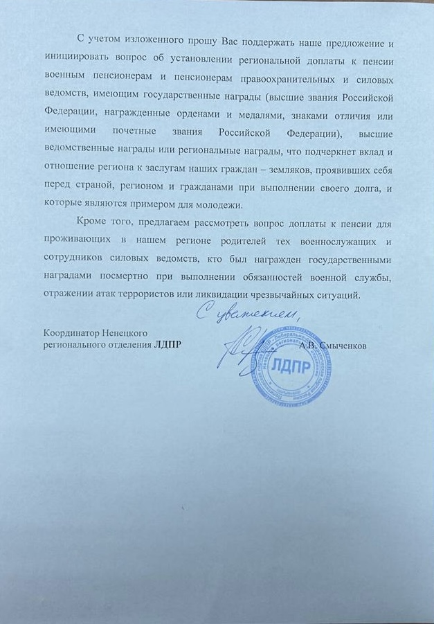 Руководитель фракции ЛДПР в Собрании депутатов НАО Андрей Смыченков инициировал установление региональных доплат к пенсиям для военных, ветеранов правоохранительных органов и силовых ведомств с государственными, ведомственными и региональными наградами. Также ЛДПР предлагает ввести доплаты к пенсиям родителей военнослужащих, награждённых посмертно.
