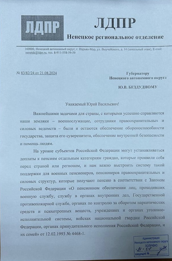 Руководитель фракции ЛДПР в Собрании депутатов НАО Андрей Смыченков обратился к главе региона с инициативой установления доплаты к пенсии для категорий граждан, которые проявили себя перед Отечеством