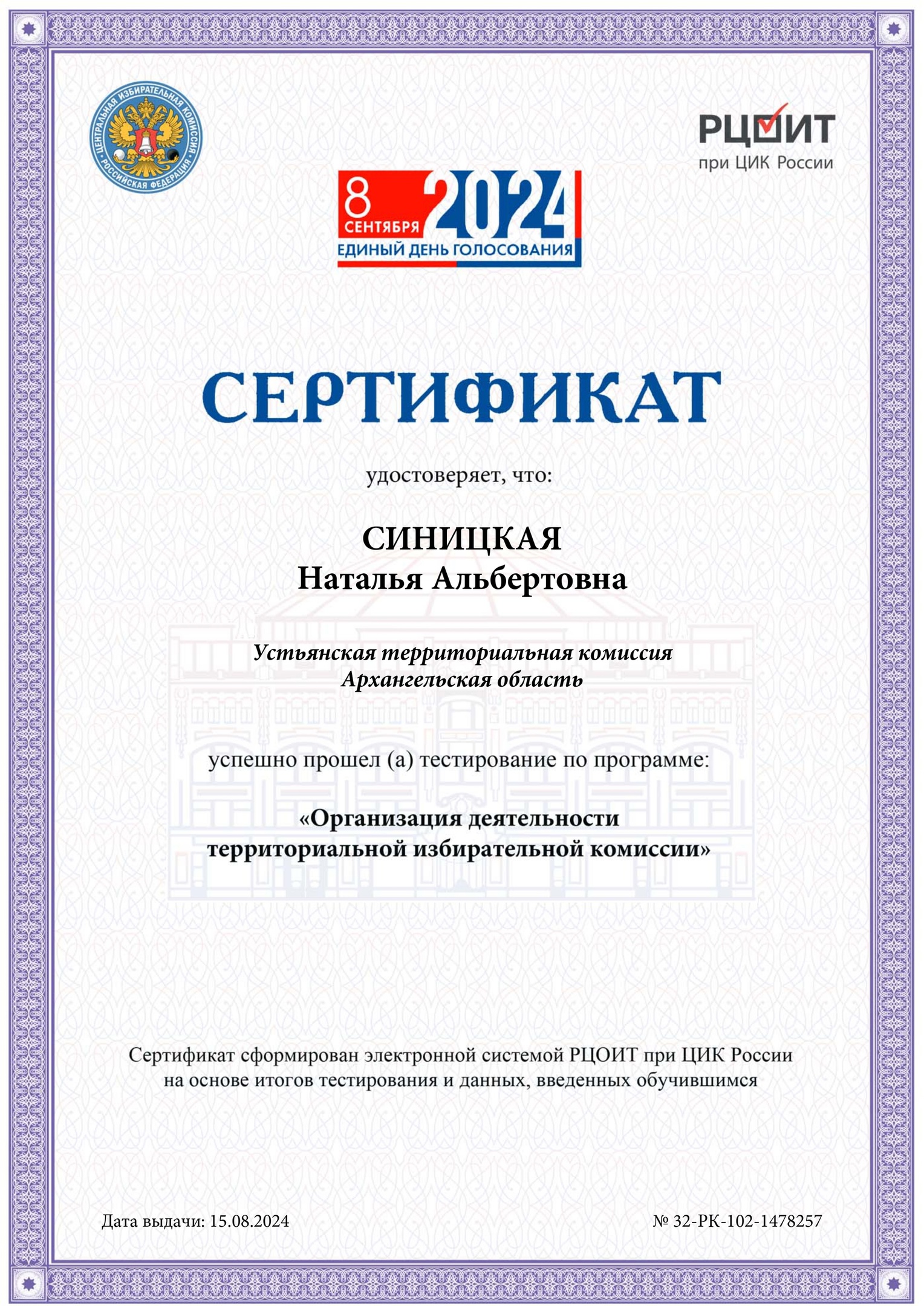 В этот раз Наталья Синицкая признана успешно освоившей программу по итогам тестирования, которое было проведено Российским центром обучения избирательным технологиям при ЦИК России.