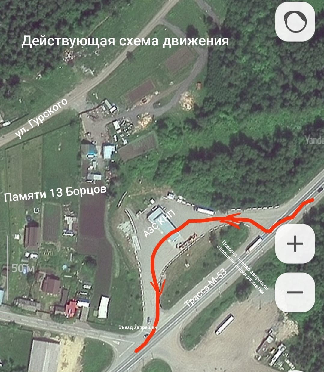 «Водителям приходится выезжать на трассу в сторону Красноярска, проехать до ближайшего разворота возле кафе «Сёстры». В другом месте не развернуться, идет двойная сплошная. Ехать примерно километр, — рассказывает местный активист ЛДПР Игорь Конопинский. — Нужно свернуть к «Сёстрам», развернуться и выехать на трассу в сторону Борцов. Тогда уже заедешь на КНП».