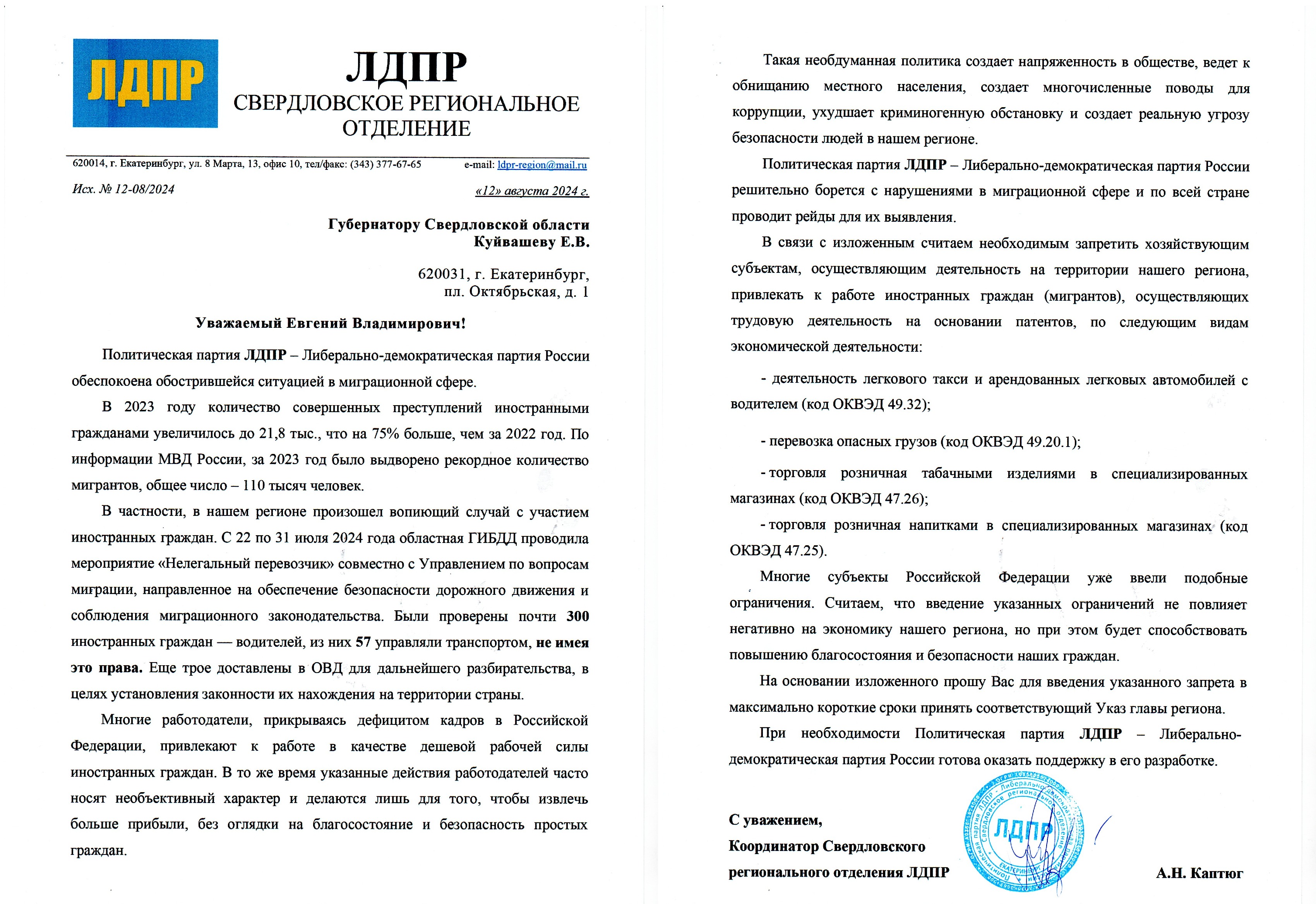 Именно поэтому координатор Свердловского регионального отделения ЛДПР Александр Каптюг направил письмо Губернатору Свердловской области Евгению Куйвашеву с просьбой запретить хозяйствующим субъектам, осуществляющим деятельность на территории региона, привлекать к работе иностранных граждан (мигрантов), осуществляющих трудовую деятельность на основании патентов, по отдельным видам экономической деятельности, в которых отсутствует объективная необходимость привлечения мигрантов с точки зрения экономики региона.