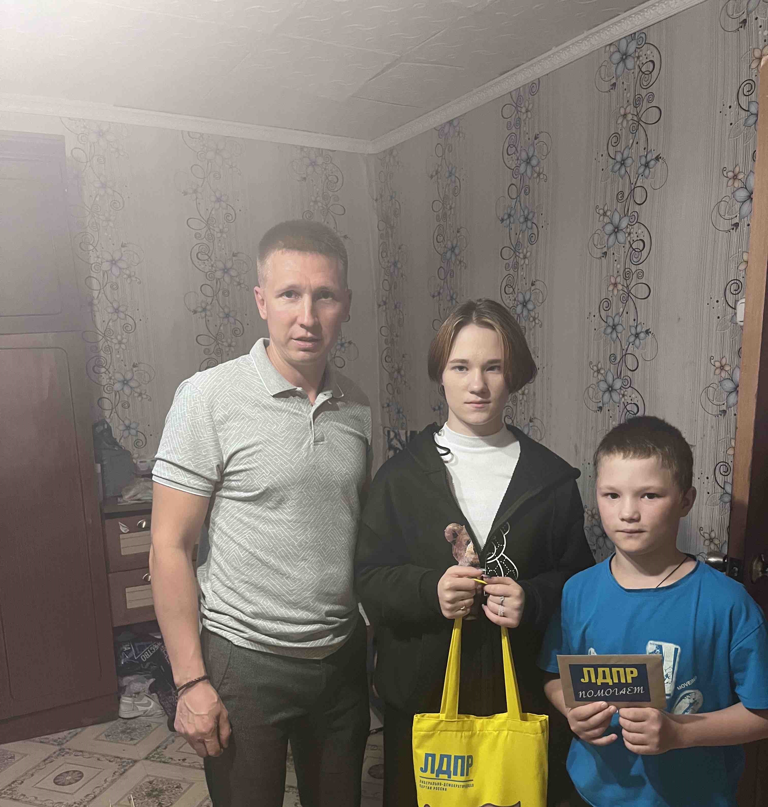 Партиец традиционно в конце августа приходит в гости с подарками от ЛДПР в семьи, оказавшиеся в сложной жизненной ситуации, и вручает сертификаты в магазин канцтоваров