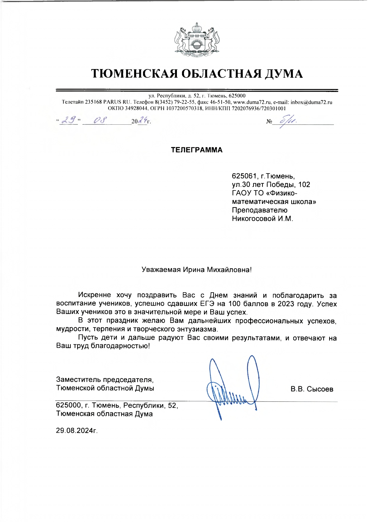 В День знаний Владимир Сысоев направил поздравительные телеграммы педагогу Физико-математической школы, которая в 2023 году подготовила сразу 14 учеников «стобалльников» по математике. А также педагогам Исетского и Уватского районов, ученики которых также сдали ЕГЭ на 100 баллов, первыми в этих районах