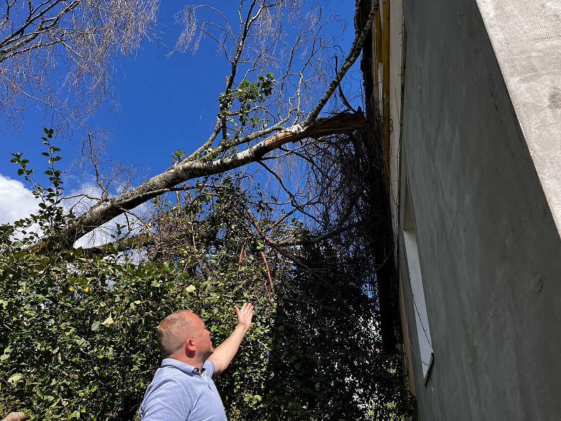 К депутату Заксобрания Калининградской области Евгению Мишину обратилась жители дома с переулка Аральский 1а-1 областного центра. По их словам, после сильного шторма на дом завалилась дерево. Повредило крышу, водосток, с проломанной крыши течет вода, а ствол так и висит на стене, что не безопасно.