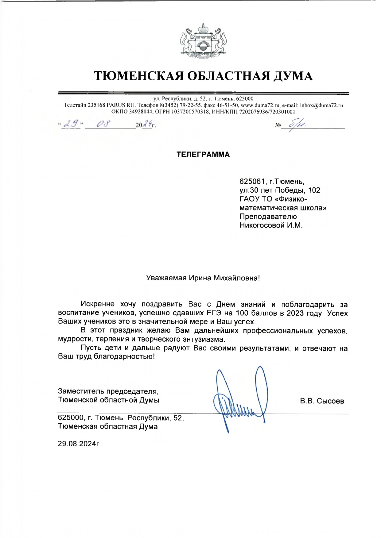 В День знаний Владимир Сысоев направил поздравительные телеграммы педагогу Физико-математической школы, которая в 2023 году подготовила сразу 14 учеников «стобалльников» по математике. А также педагогам Исетского и Уватского районов, ученики которых также сдали ЕГЭ на 100 баллов, первыми в этих районах