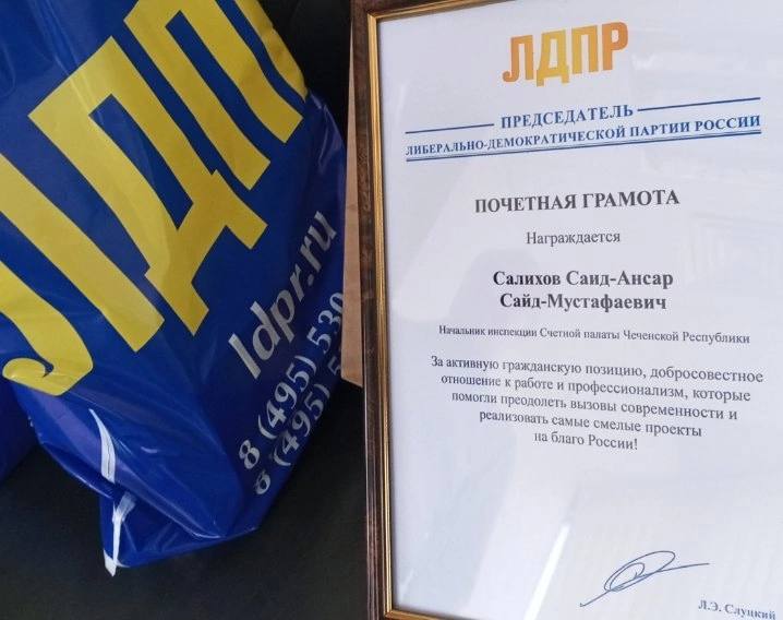 В связи с празднованием профессионального праздника представители Чеченского Регионального отделения ЛДПР посетили офис Счетной Палаты Чеченской Республики, где провели торжественную церемонию вручения Почетной грамоты партии, которой в связи с празднованием Дня финансиста награждён начальник инспекции Счетной палаты Салихов Саид-Ансар Сайд-Мустафаевич