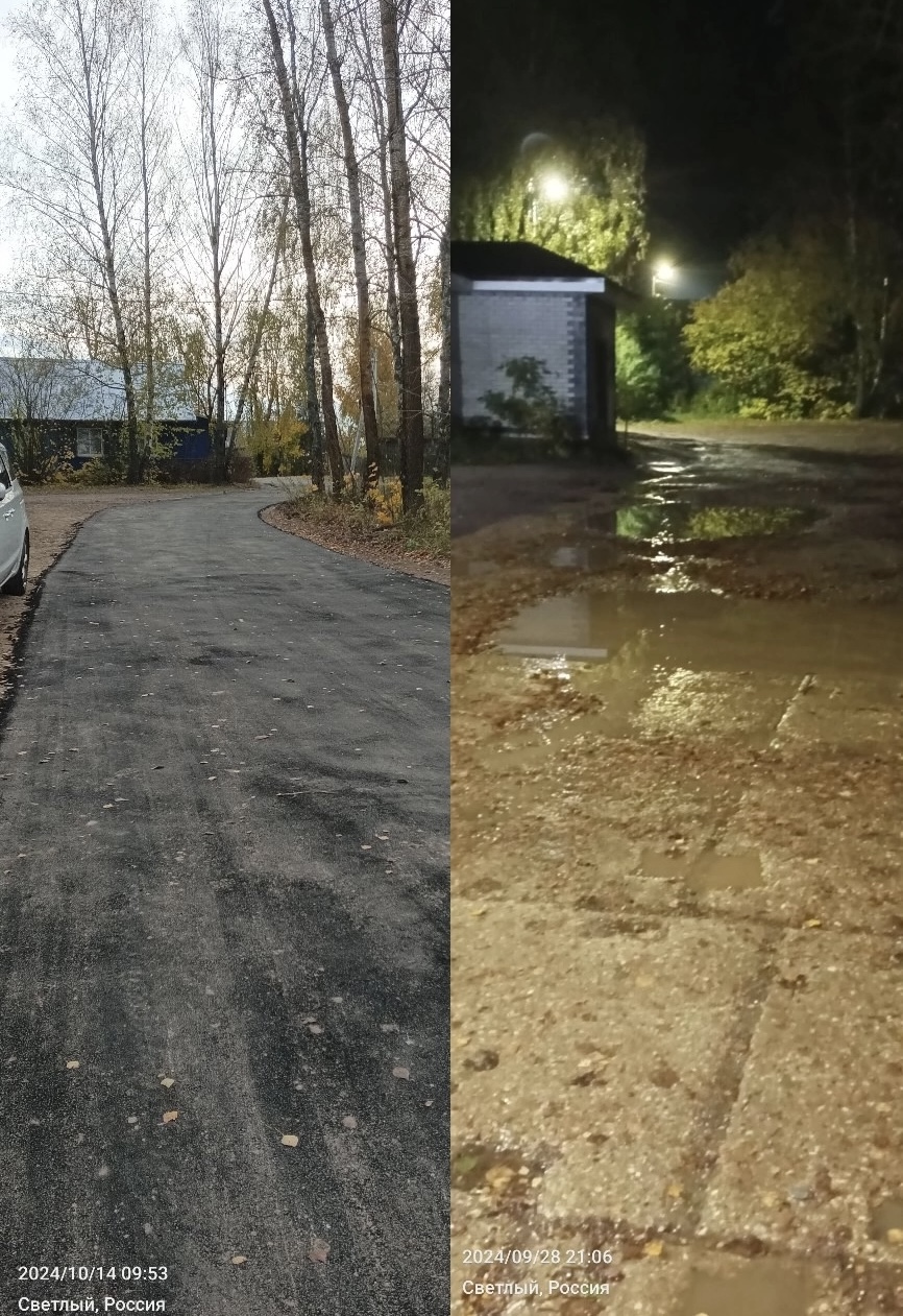 Дорогу выровняли и присыпали тонким слоем асфальта, прикрыв грязь. Тем не менее, теперь можно спокойно пройти по этой дороге, не варьируя между ямами с водой и другими неровностями.
