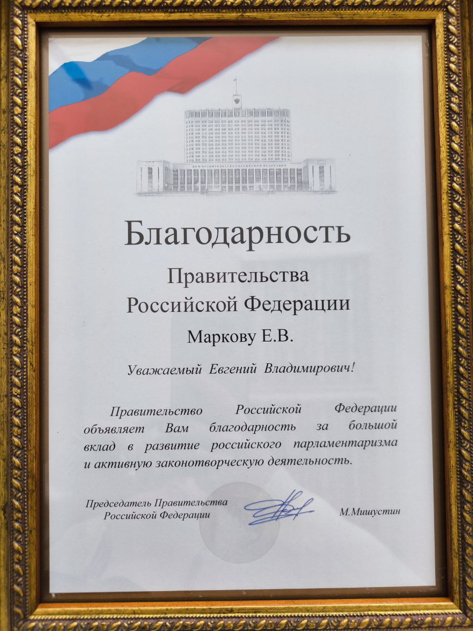 Депутат Госдумы от ЛДПР Евгений Марков сообщил о получении благодарственного письма от Правительства РФ за развитие парламентаризма и активную законотворческую деятельность