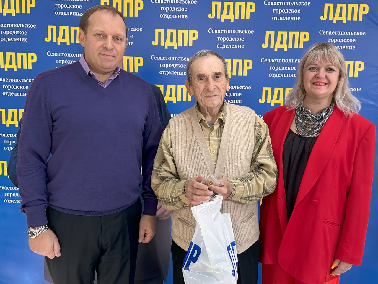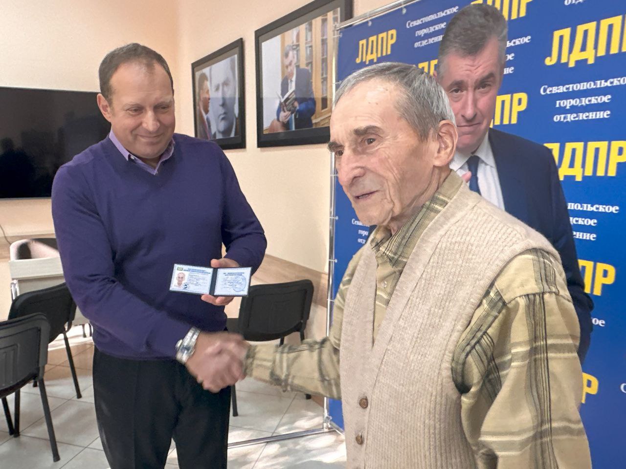 Координатор Севастопольского отделения ЛДПР Илья Журавлев лично вручил партийные билеты новым, вступившим в партию членам. Поздравив также одного из участников с юбилеем. Юрию Бондаренко исполнилось 85 лет!