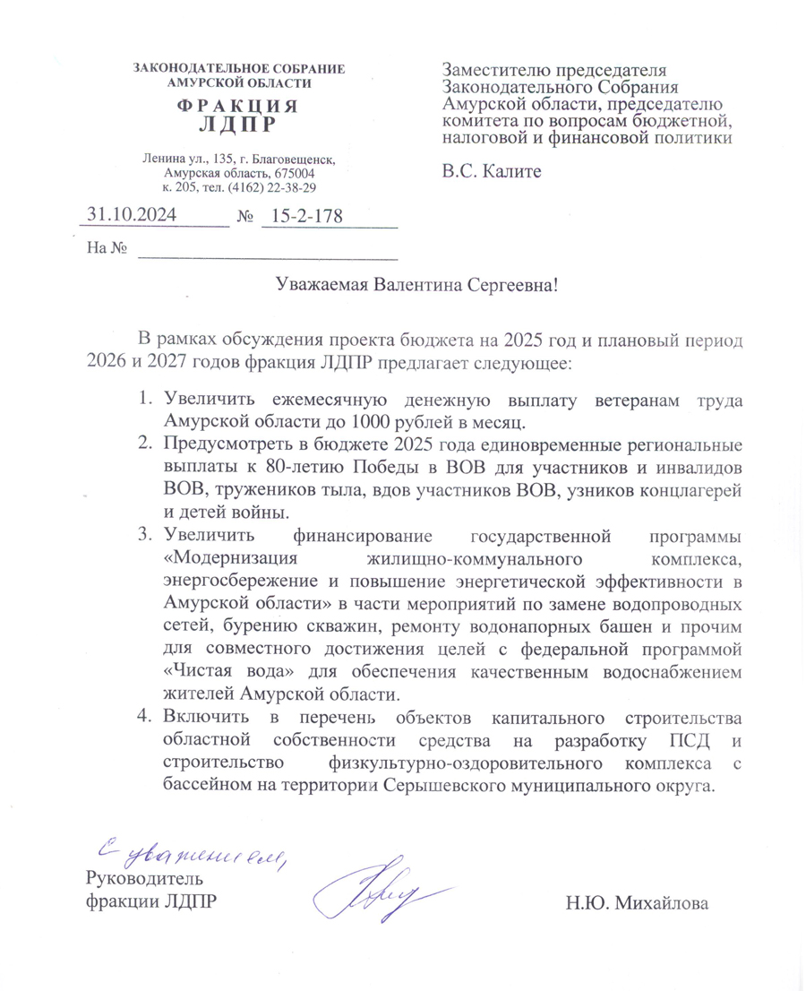 С 6 по 8 ноября 2024 года состоится обсуждение проекта областного бюджета на 2025 год и плановый период 2026 и 2027 годов. Все желающие могут задать вопросы, изложить замечания и предложения по законопроекту. Фракция ЛДПР в Законодательном Собрании Амурской области всегда выходит со своими законодательными инициативами