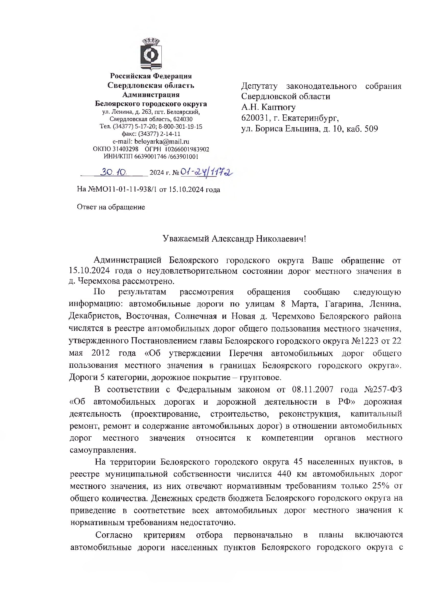 Так, к депутату Законодательного Собрания Свердловской области Александру Каптюгу обратился Максим Валерьевич с просьбой отремонтировать автомобильную дорогу в деревню Черемхова, Белоярского района Свердловской области.