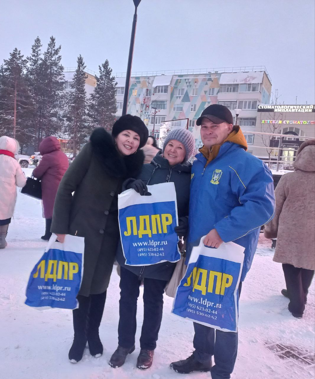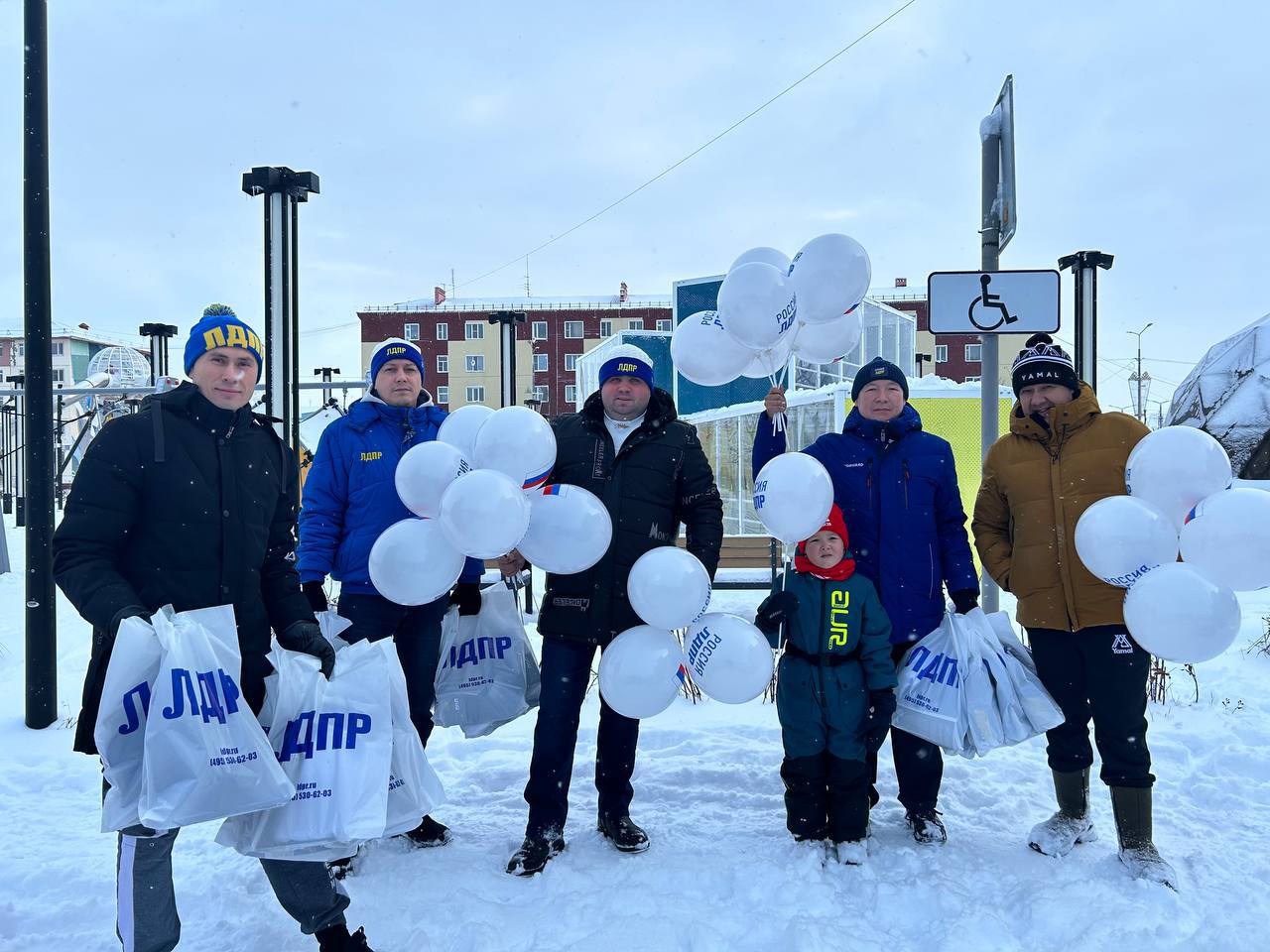 В Салехарде координатор местного отделения ЛДПР и активисты вышли на улицы города для поздравления горожан. Дарили шарики, партийные подарки.