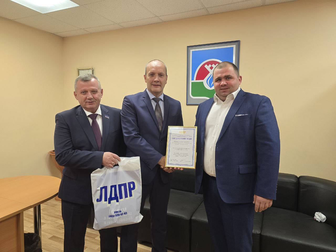 По поручению Председателя ЛДПР Леонида Слуцкого вручили председателю Территориальной избирательной комиссии Надымского района Андрею Юрлову благодарственное письмо за многолетний добросовестный труд и высокий профессионализм.