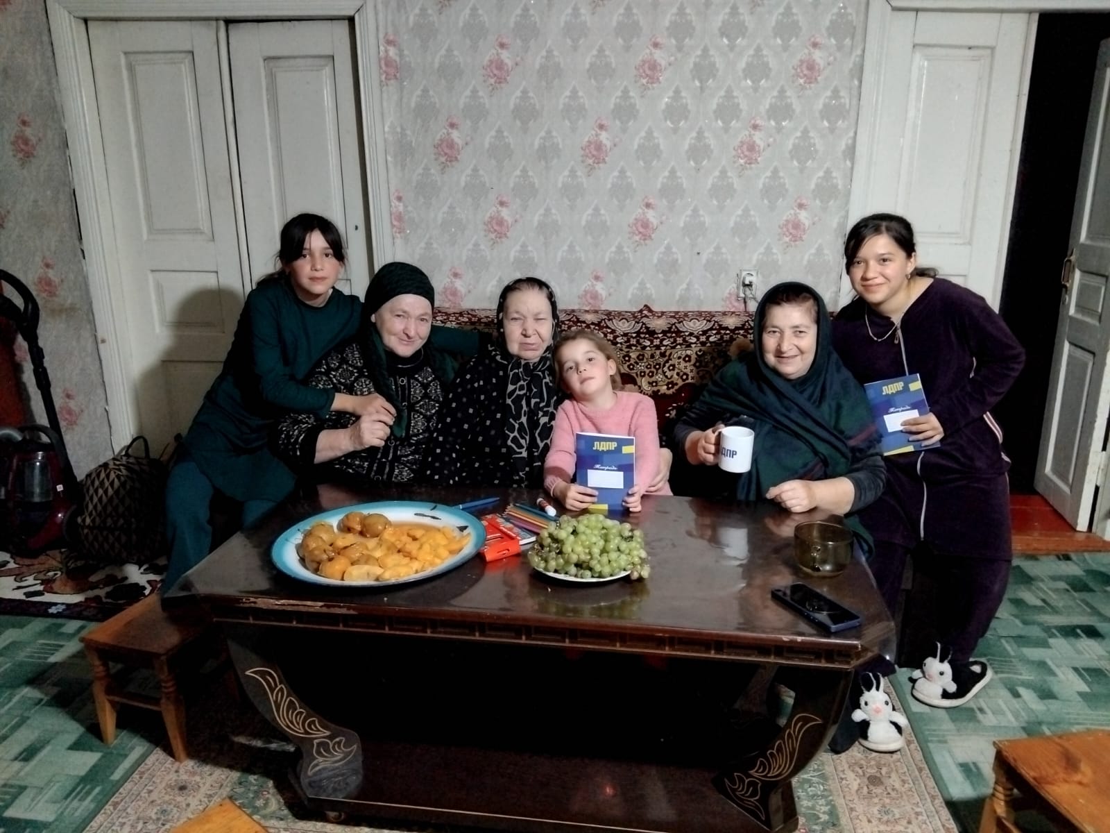 Встреча с семьёй Гаджиевых прошла тепло и весело, с ароматным чаем ЛДПР и домашней выпечкой от бабушки. От имени партии детей порадовали подарками и вручили им школьные принадлежности с символикой ЛДПР.