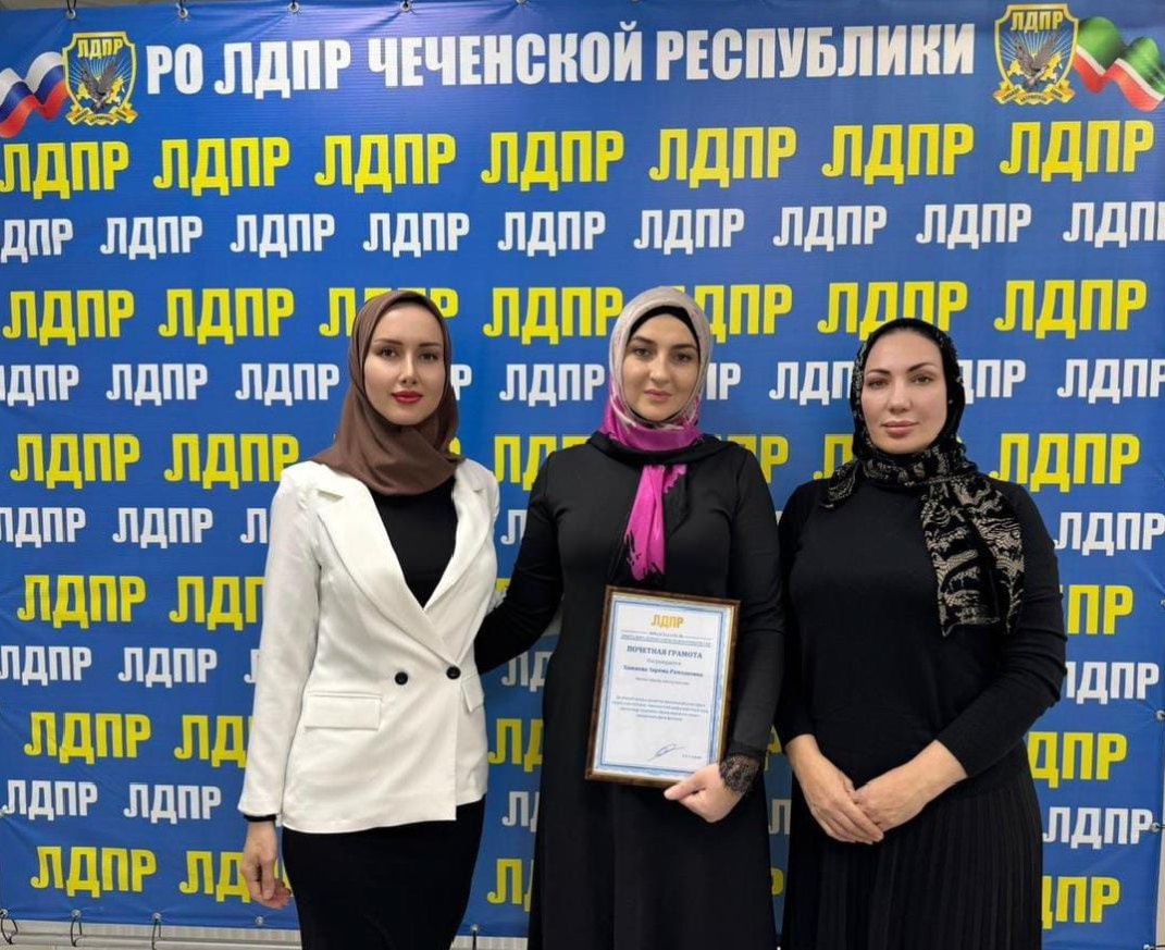 В этот день в офисе регионального отделения ЛДПР состоялось вручение Почетной грамоты партии замечательному фитнес-тренеру Зареме Хажиевой - основательнице женской студии массажа и фитнеса "Relax Zone" в станице Наурская. Здесь проводятся групповые тренировки, включая кроссфит и дистанционные занятия.