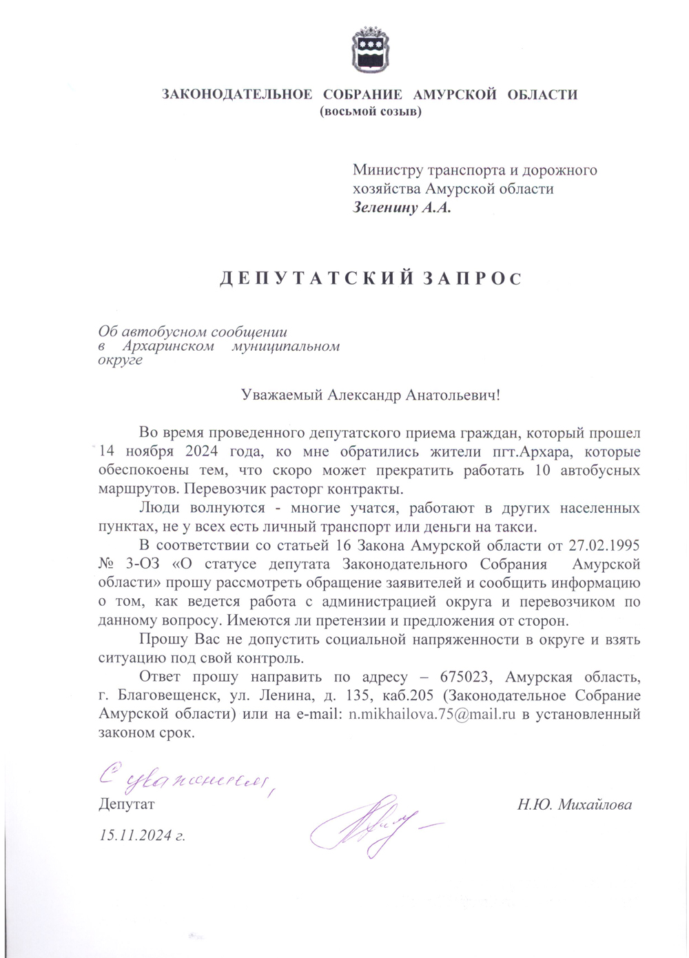 Уже 15 ноября Наталья Михайлова направила депутатский запрос в Министерство транспорта и дорожного хозяйства Амурской области с просьбой вмешаться в ситуацию и не допустить социальной напряженности в округе и взять ситуацию под свой контроль. Здесь нужно обязательно выслушать доводы сторон, проработать вопрос совместно с властями и самим перевозчиком, чтобы выяснить причины расторжения контрактов и помочь решить проблемы на областном уровне.