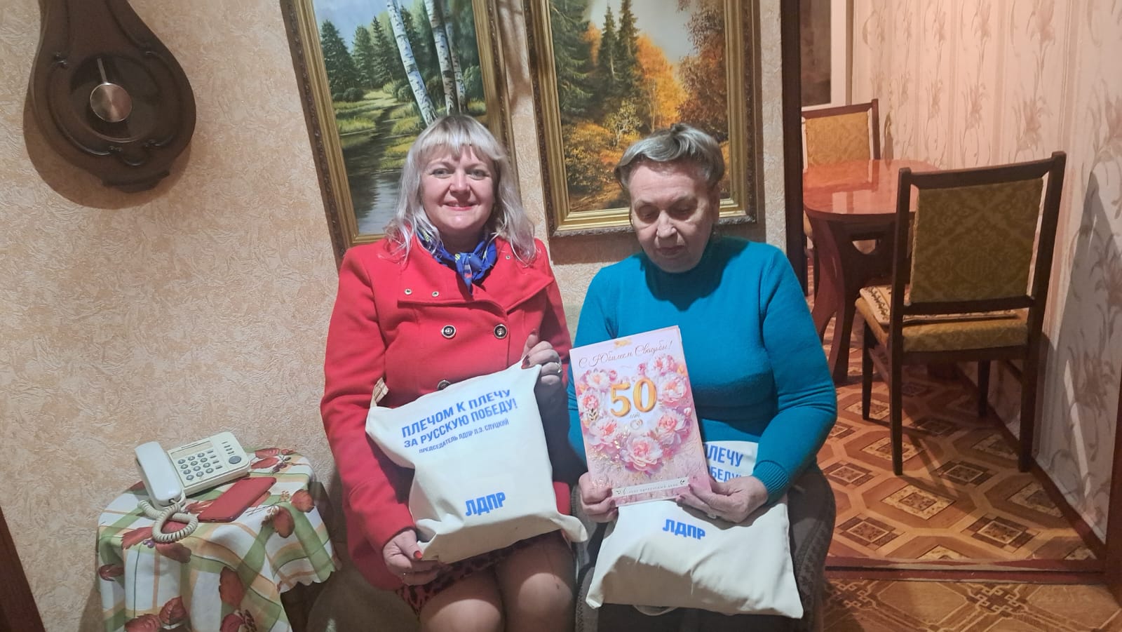 Координатор Ленинского района ЛДПР Виктория Этенко и координатор первичного отделения «Школа №38» Лидия Головань поздравили семью Ситниковых с золотой свадьбой