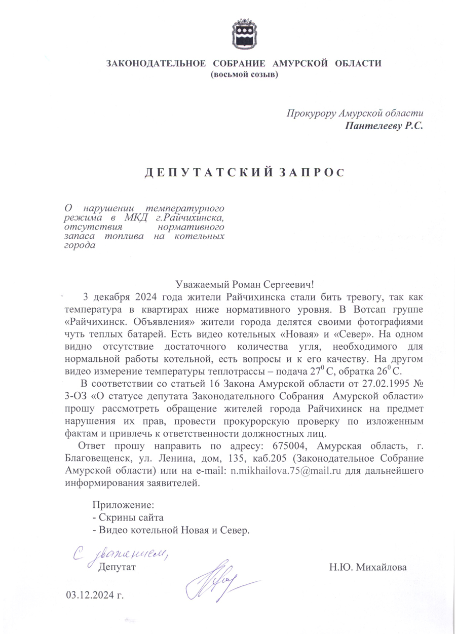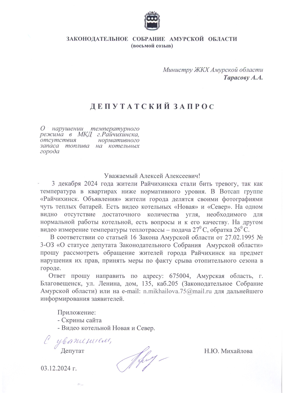 «Я считаю недопустимым такое бездействие местных властей, которые должны были обеспечить бесперебойное прохождение отопительного сезона. Сегодня только третий день зимы, а что ждать дальше? Поэтому я направила депутатские запросы в Министерство ЖКХ Амурской области и областную прокуратуру. Нужно принимать незамедлительные меры!» - уверена руководитель фракции ЛДПР.
