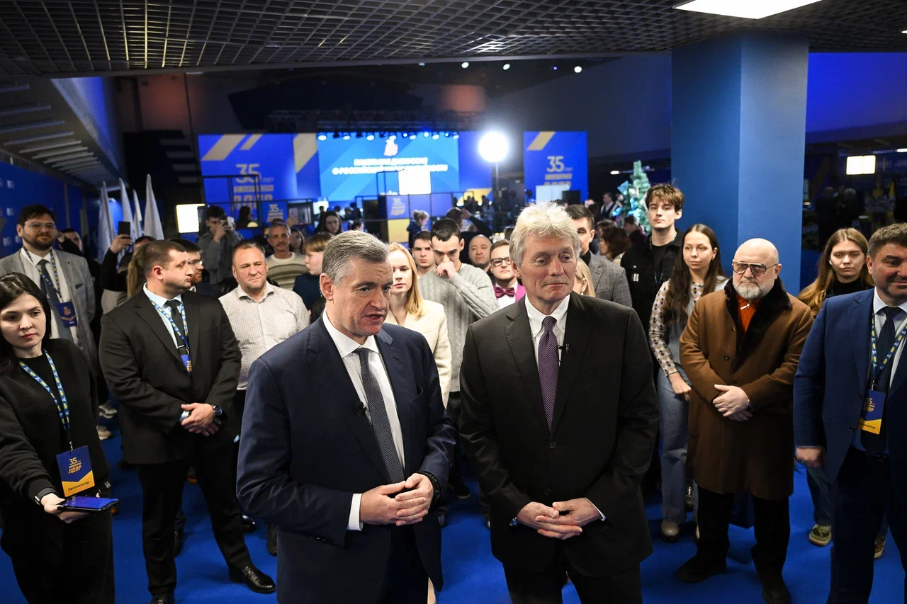 Дмитрий Песков с большим интересом познакомился с экспозициями выставки, интерактивными площадками. На локации, посвящённой СВО, остановились отдельно.