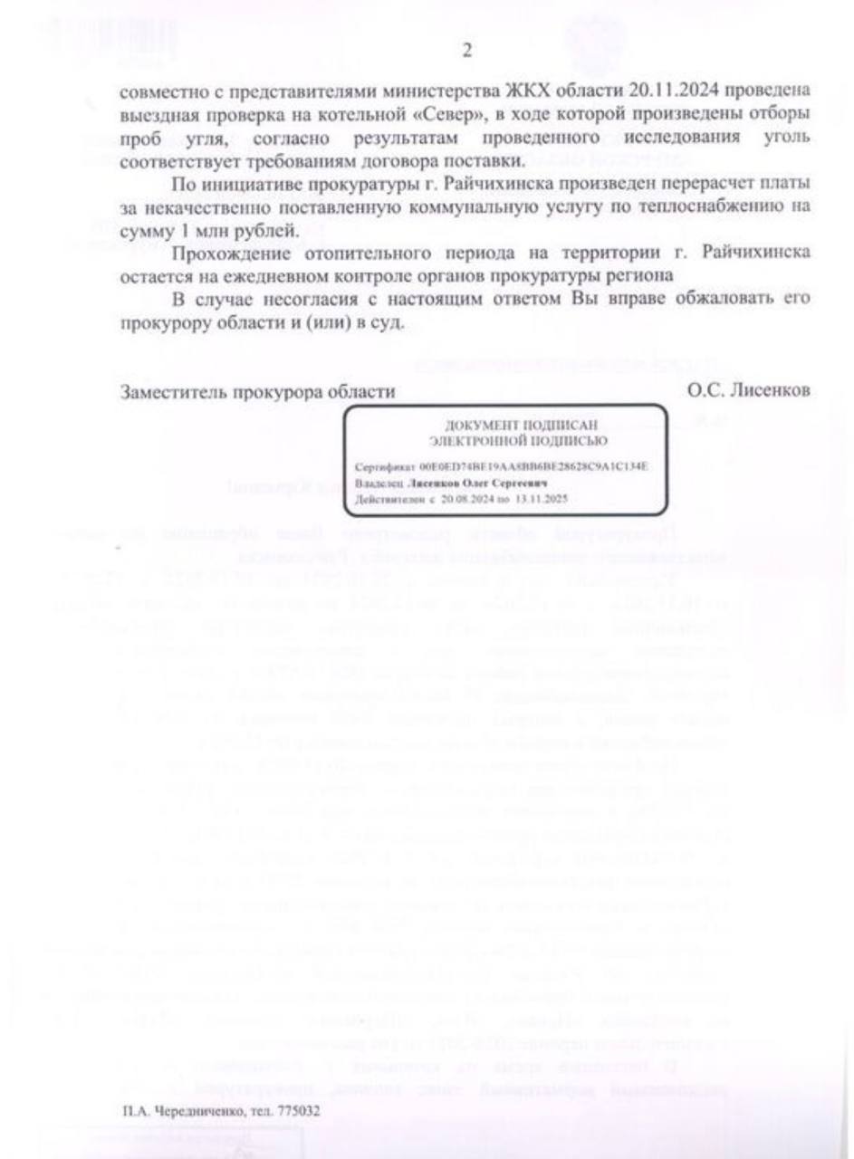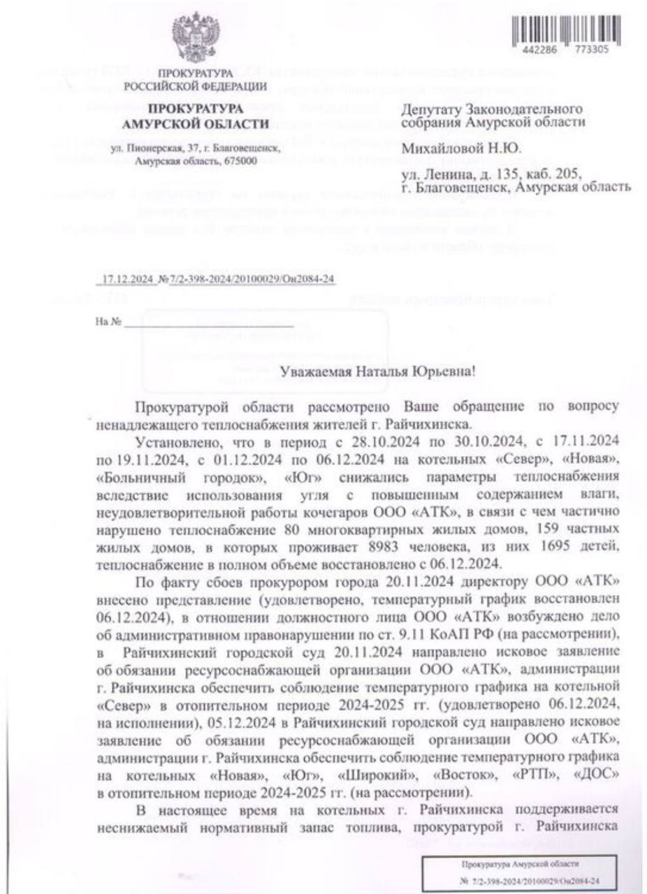 Первым ответ дало Правительство Амурской области, сообщив, что текущих производственных мощностей разреза «Ерковецкий» не достаточно для закрытия всех потребностей предприятий большой энергетики, ЖКХ, населения. Поэтому ресуроснабжающая компания ООО «АТК», обслуживающий котельные Райчихинска, вынуждена приобретать уголь с пониженными качественными характеристиками. Но вопрос у всех на контроле.