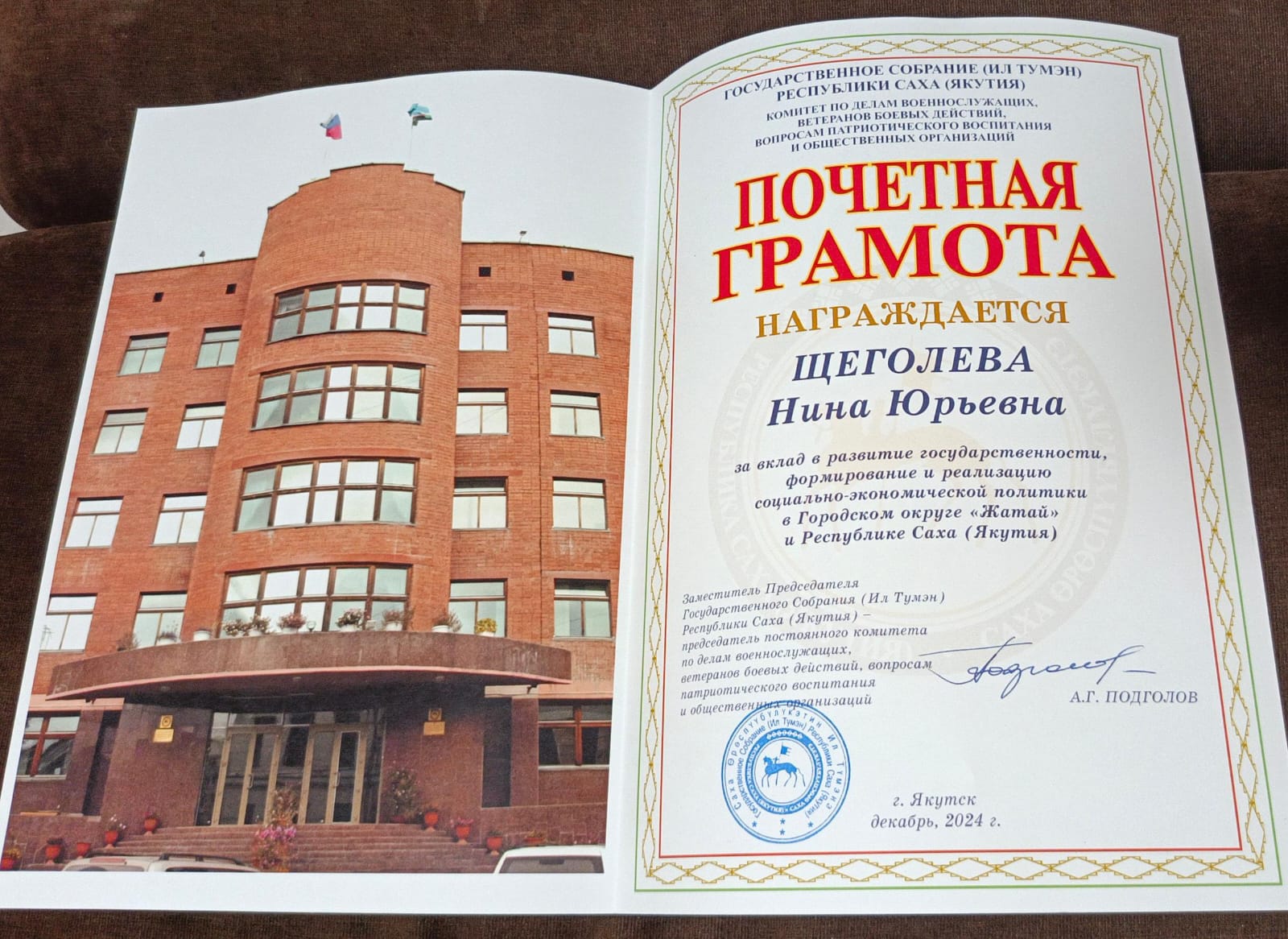 На завершающей сессии Окружного Совета депутатов ГО «Жатай» депутат Якутского РО ЛДПР Нина Щеголева была награждена Почетной грамотой Государственного Собрания (Ил Тумэн) Республики Саха (Якутия) за вклад в развитие государственности, формирование реализацию социально-экономической политики в ГО «Жатай» и Республике Саха (Якутия).