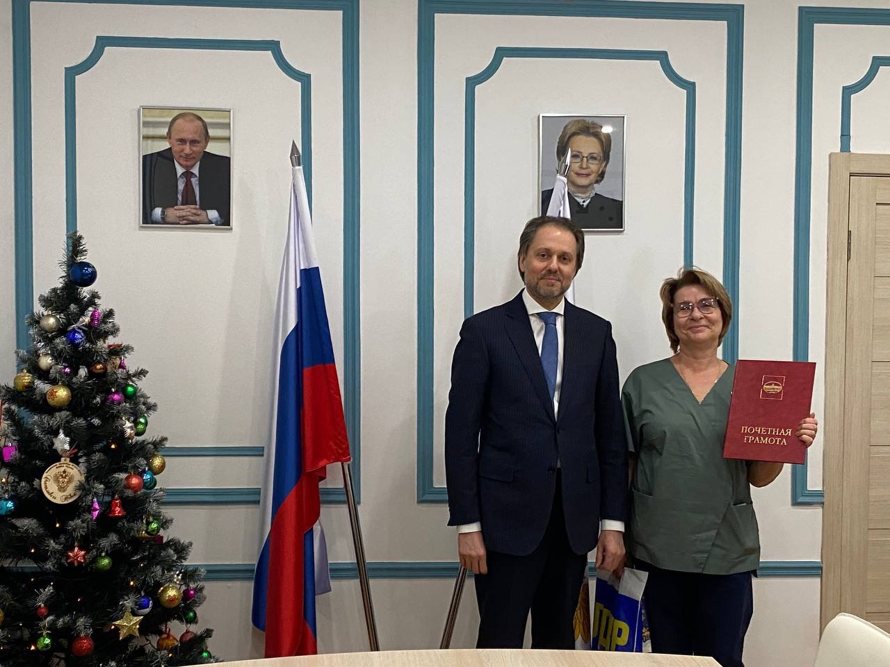 Владимир Сысоев поздравил работников с наступающими новогодними праздниками, поблагодарил медицинский персонал за высокое профессиональное мастерство и многолетний добросовестный труд в сфере здравоохранения и вручил заслуженные награды от Тюменской областной Думы.