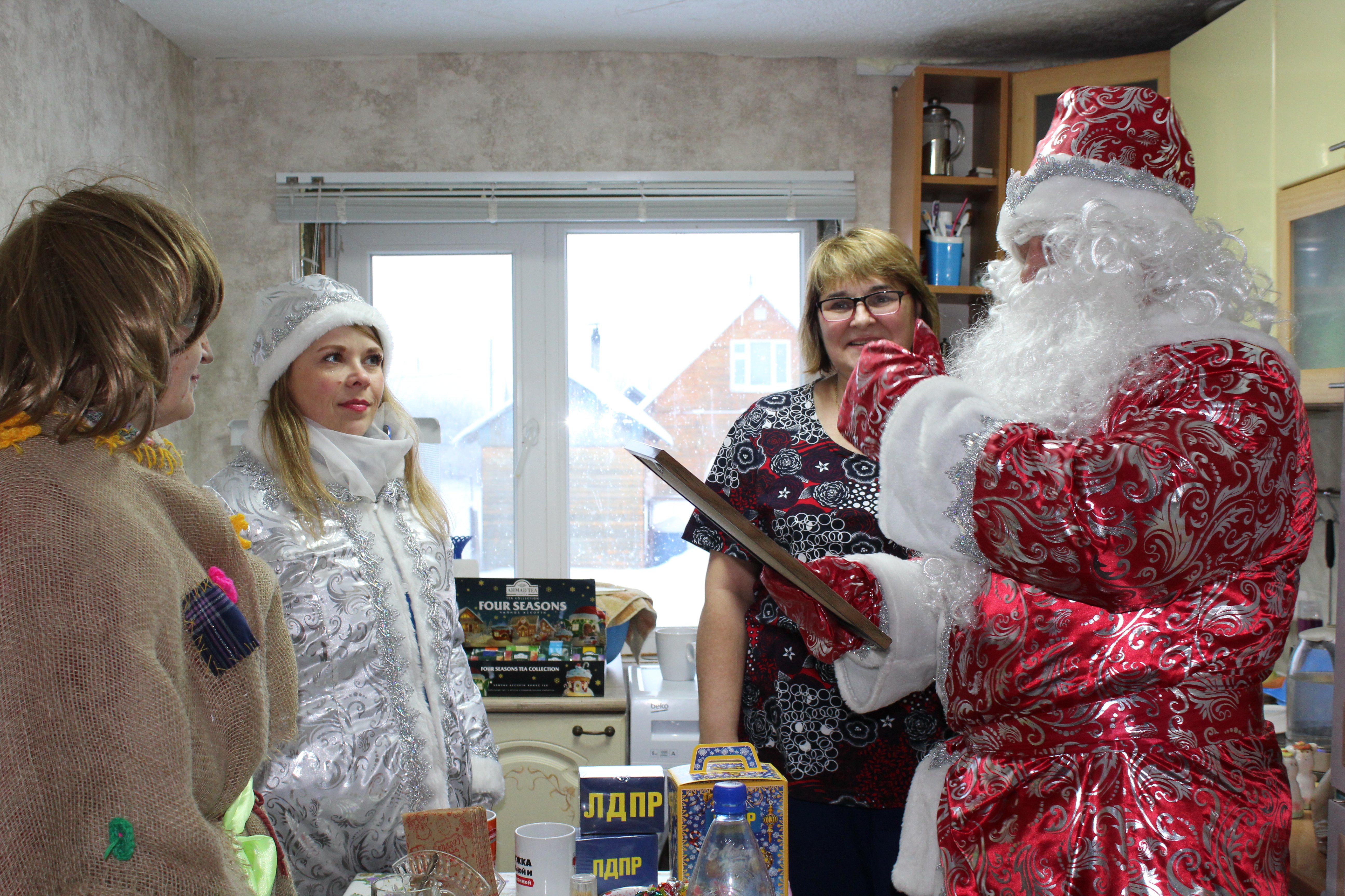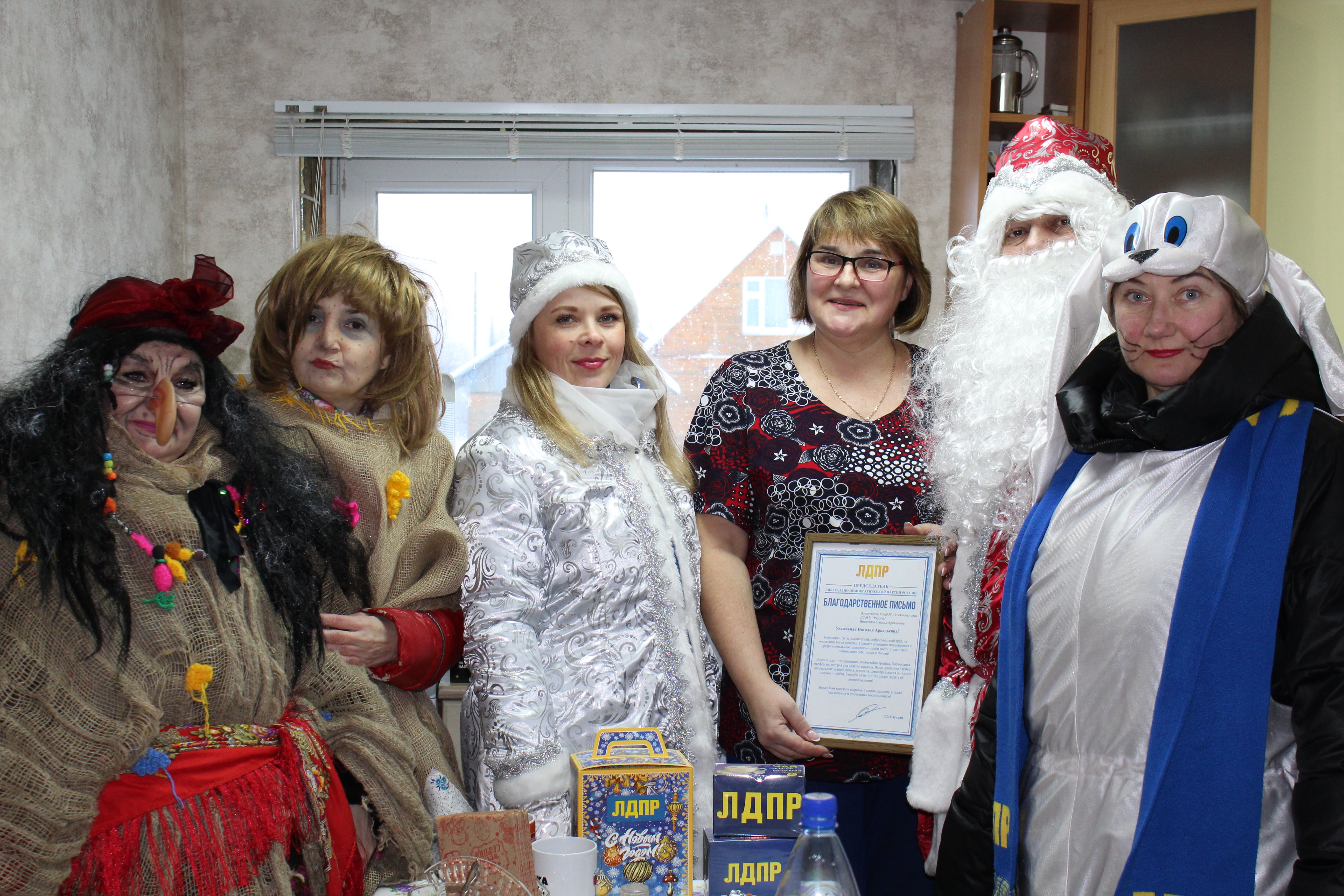 Партийный Дед Мороз во время своего визита с радостью вручил благодарственное письмо ко Дню воспитателя и всех дошкольных работников Никитиной Наталье Аркадьевне, воспитателю высшей категории МАДОУ г. Нижневартовска д/с 71 "Радость". Снегурочка поздравила с Сочельником и Рождеством Христовым, вручили и подарки от ЛДПР.
