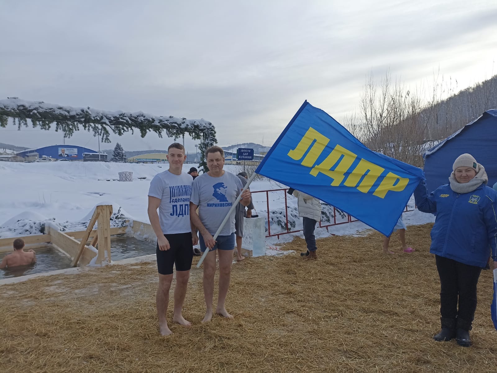 Активисты ЛДПР вместе с жителями города окунулись в прорубь. После купания всех ждал горячий чай, добрые напутствия и памятные презенты с атрибутикой партии