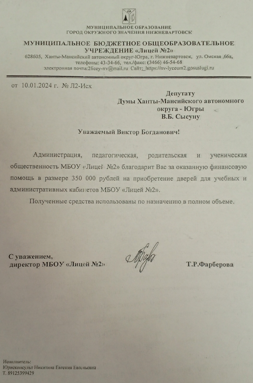 Сегодня поступило письмо с благодарностью депутату Думы Югры Виктору Сысуну за оказанную финансовую помощь в размере 350 000 рублей на приобретение новых дверей для учебных и административных кабинетов