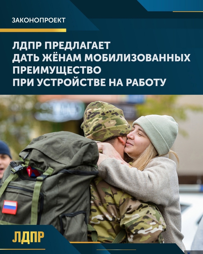 Депутаты фракции ЛДПР в Государственной Думе во главе с Председателем партии Леонидом Слуцким внесли законопроект, который предлагает предоставить жёнам мобилизованных преимущественное право при трудоустройстве в государственные организации и воинские части, а также защиту от увольнения при сокращении штата