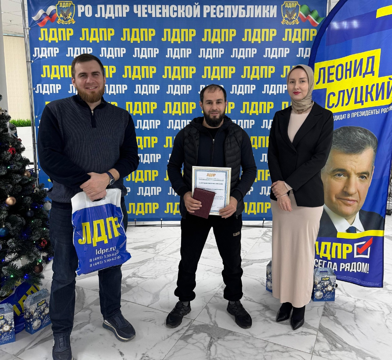По случаю праздника в офисе Чеченского регионального отделения ЛДПР прошла церемония вручения Благодарственных писем двум лифтерам "Бизнес- центра"- одного из самых высоких зданий Грозного, Ильясу Эльмурзаеву и Бекхану Хамзаеву.