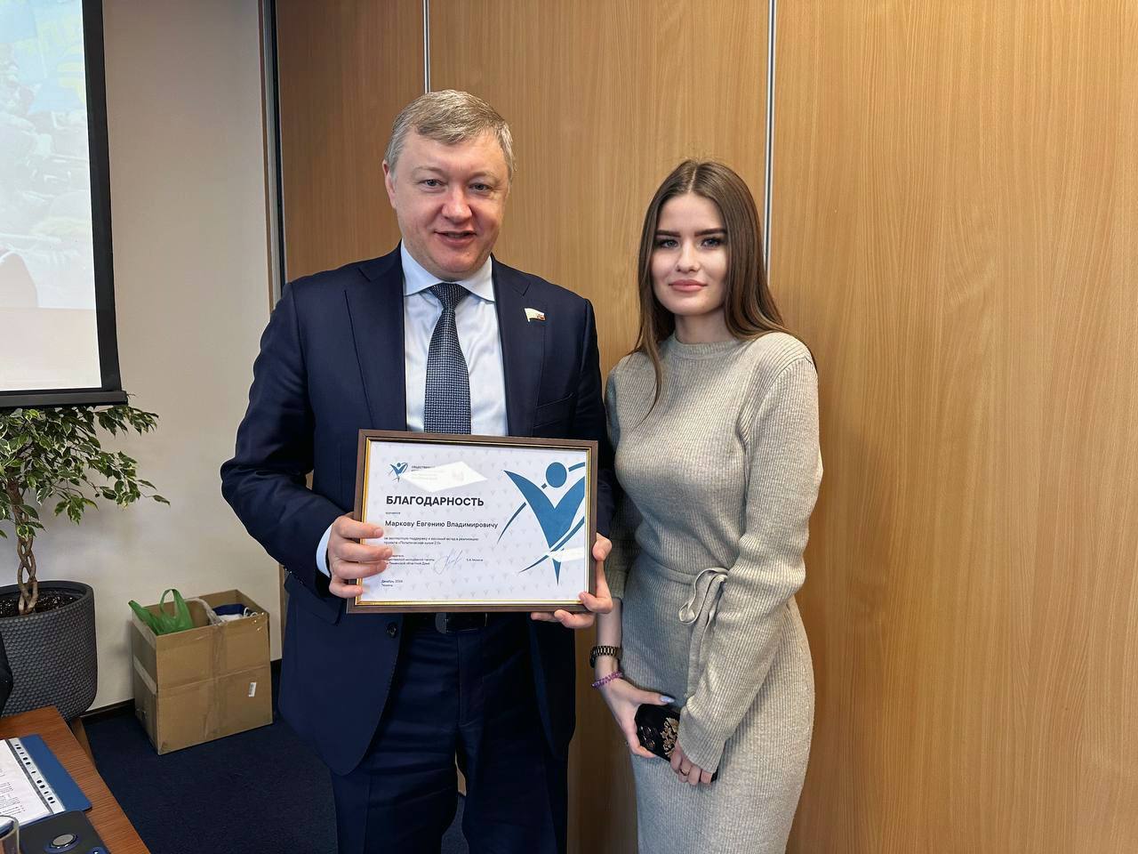 От лица членов Общественной молодежной палаты при Тюменской областной Думе Виктория Черепанова вручила Благодарность Евгению Маркову за экспертную оценку и значительный вклад в реализацию проекта молодых парламентариев «Политическая кухня».