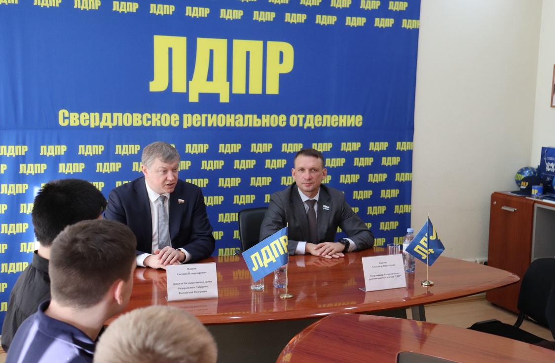В рамках рабочего визита в Екатеринбург заместитель председателя Комитета Государственной Думы по экологии, природным ресурсам и охране окружающей среды, депутат Государственной Думы РФ Евгений Марков провел встречу с молодежным крылом ЛДПР, посвященную актуальным вопросам экологии. На мероприятии присутствовал координатор Свердловского регионального отделения ЛДПР, депутат Законодательного Собрания Свердловской области Александр Каптюг