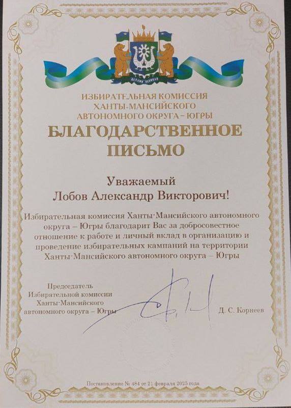 Избирательная комиссия Ханты-Мансийского автономного округа отметила многолетнюю и плодотворную работу Александра Лобова, вручив ему в награду благодарственное письмо за добросовестное отношение к своим обязанностям и значительный личный вклад в организацию и проведение избирательных кампаний на территории региона
