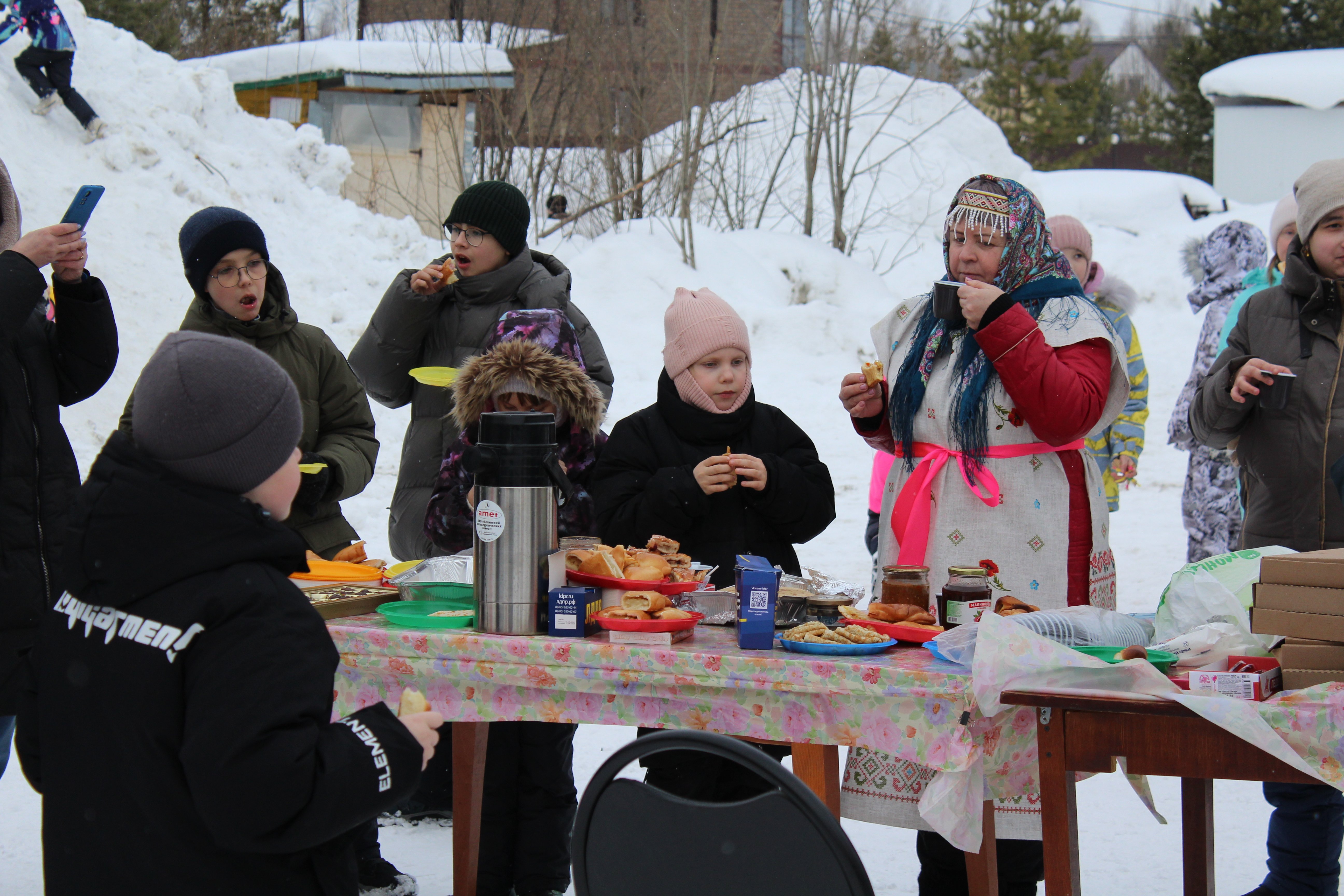 Какая же Масленица без угощений! Ароматные, румяные блины, пышные пироги и согревающий чай с дымком создавали атмосферу уюта и гостеприимства. Запах свежей выпечки манил к столам, где можно было отдохнуть, пообщаться и почувствовать себя частью большой и дружной семьи.