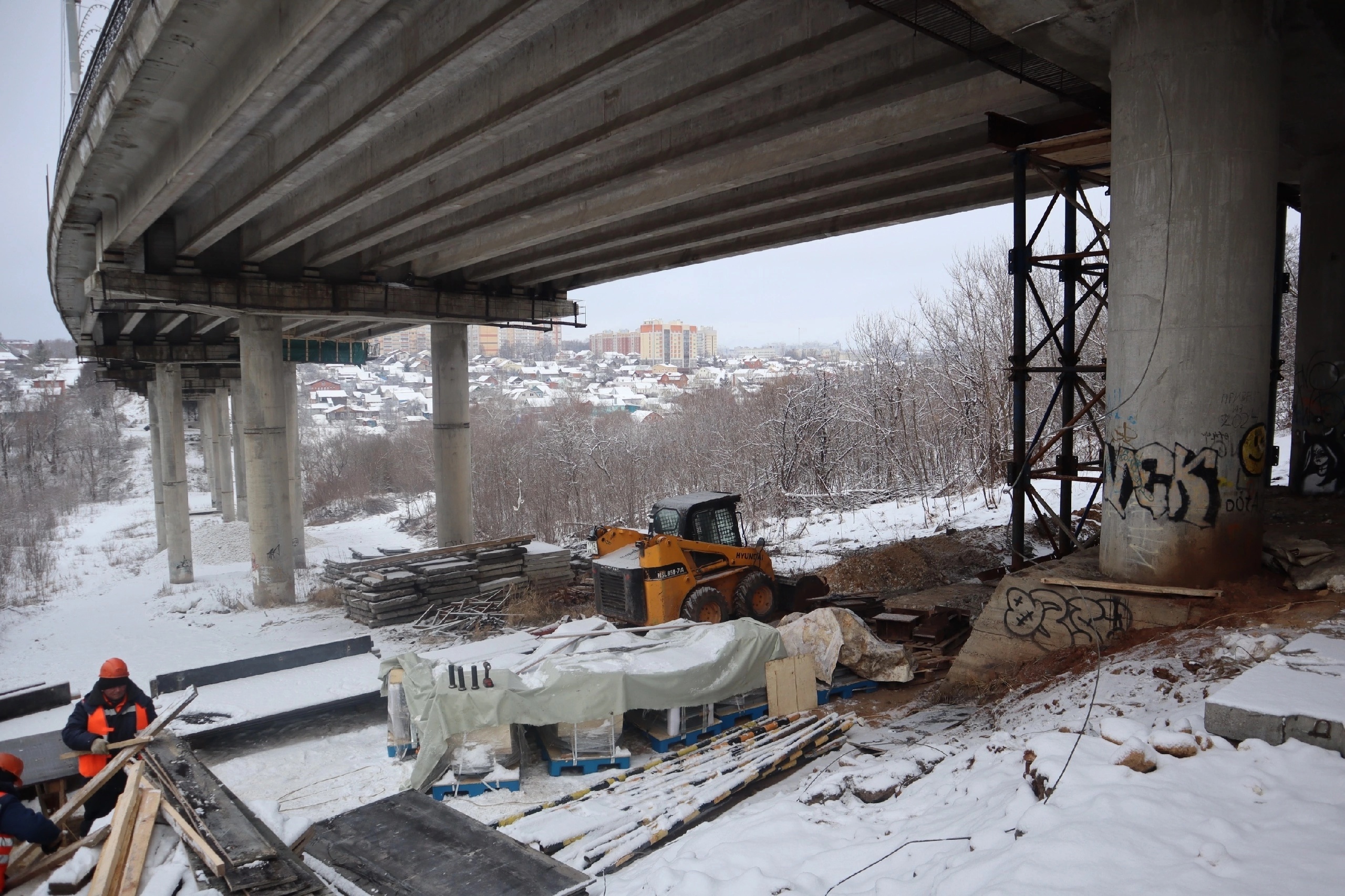 Первым объектом инспекции стал Гагаринский мост — он соединяет одной транспортной связью центр города, его юго-западную часть и северо-запад. Завершение работ согласно контракту – 30 октября 2026 года. Сейчас здесь завершены демонтажные работы по верхнему строению 1-й половины и одновременно ведётся замена опорных частей.