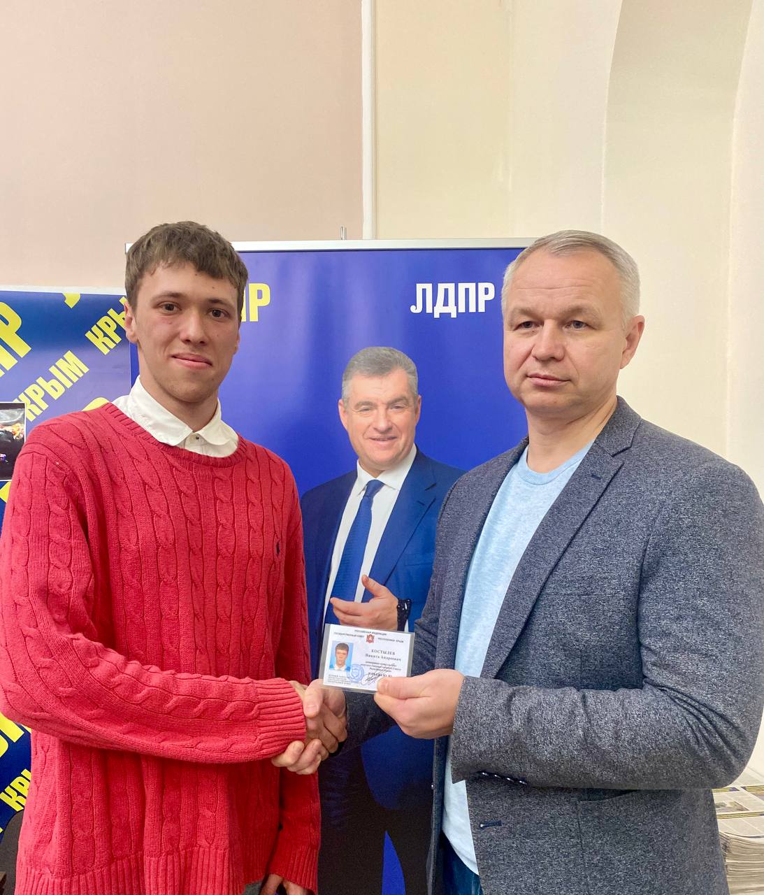 В торжественной обстановке в штабе Крымского регионального отделения получил удостоверение личного помощника из рук депутата Госсовета Крыма Юрия Юрьева молодой партиец Никита Костылев. Приятным дополнением к документу стали наручные часы с символикой ЛДПР.