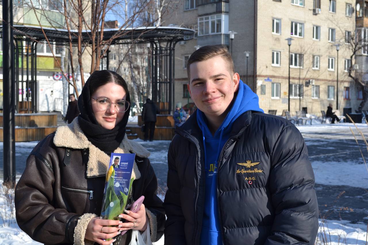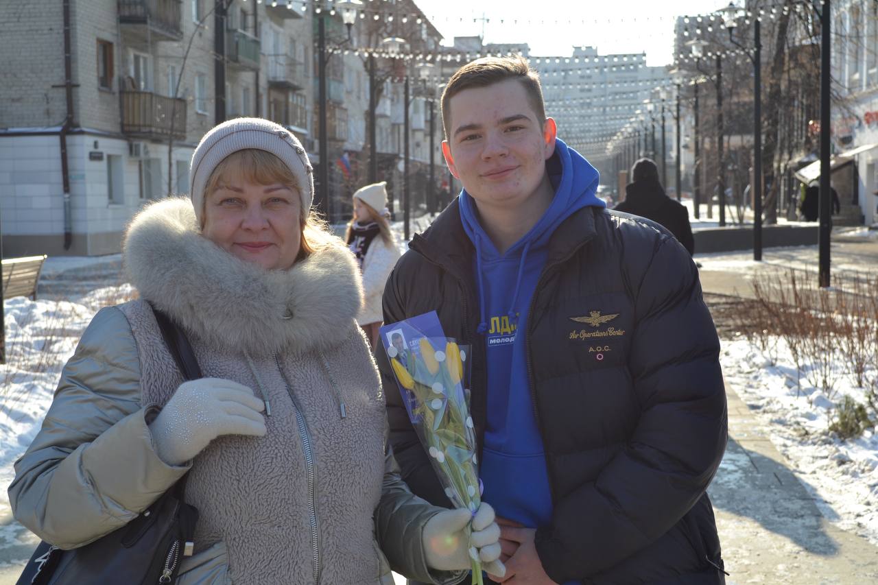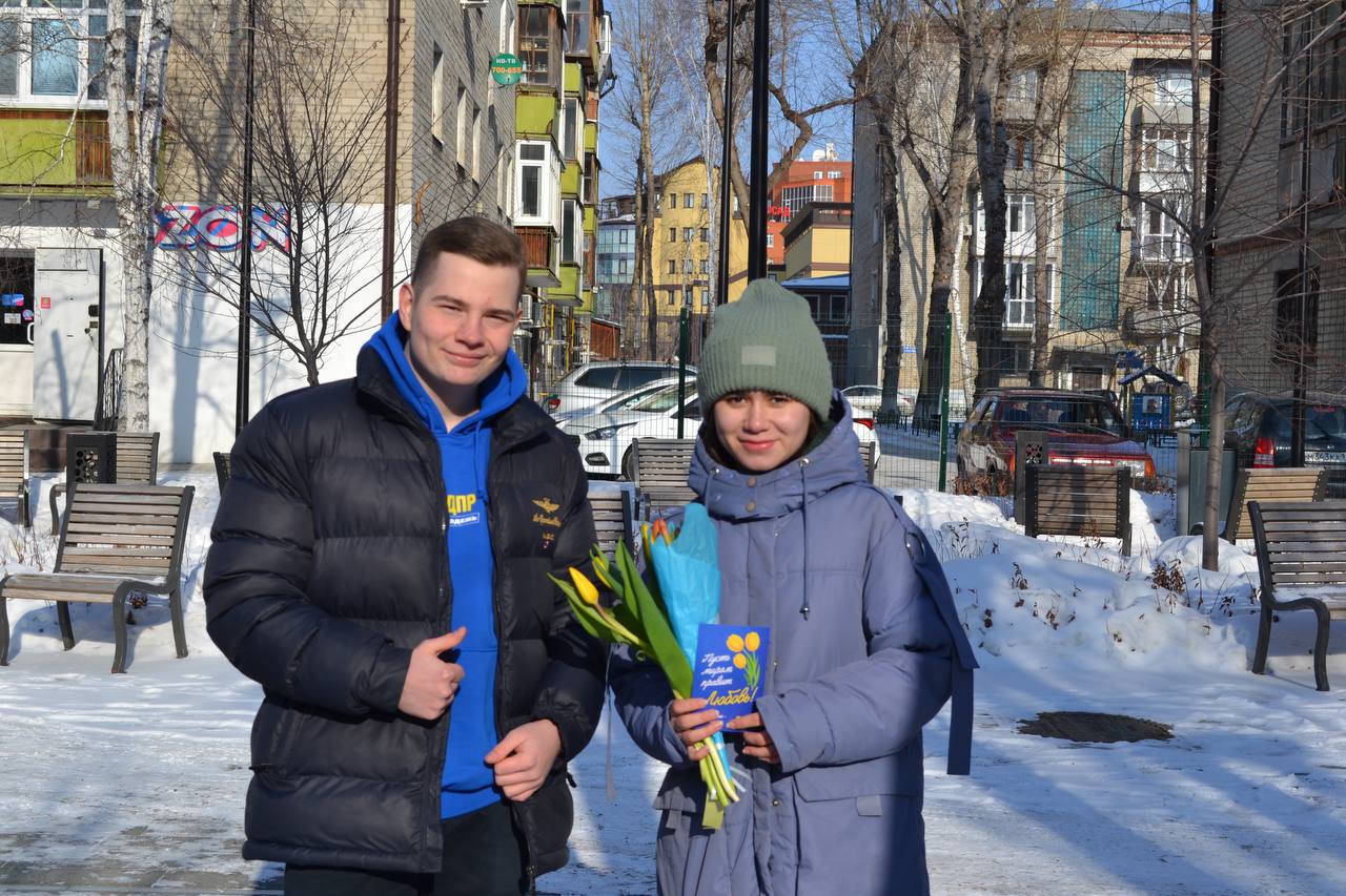 Помощник координатора Тюменского регионального отделения ЛДПР по работе с молодежью Артём Валгушкин и активисты молодежного крыла Евгений Палкин, Алексей Радужнинский и Егор Ливанов порадовали тюменских девушек яркими открытками и тюльпанами в Международный женский день