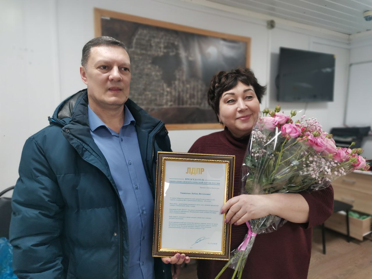 Максим Попов передал Любови Витальевне поздравительный адрес от имени председателя ЛДПР Леонида Слуцкого, в котором были отмечены её многолетний труд, преданность делу и активная гражданская позиция. В своём обращении Леонид Слуцкий подчеркнул, что такие люди, как Любовь Витальевна, являются опорой для общества и вдохновляют окружающих своим примером.