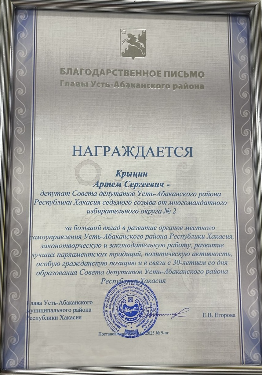 На праздничной сессии Совета депутатов Усть-Абаканского района, приуроченной к 30-летию со дня образования Совета депутатов Усть-Абаканского района Республики Хакасия, Глава Усть-Абаканского района Е.В. Егорова вручила благодарственное письмо депутату Усть-Абаканского района от ЛДПР, Артёму Сергеевичу Крыцину.