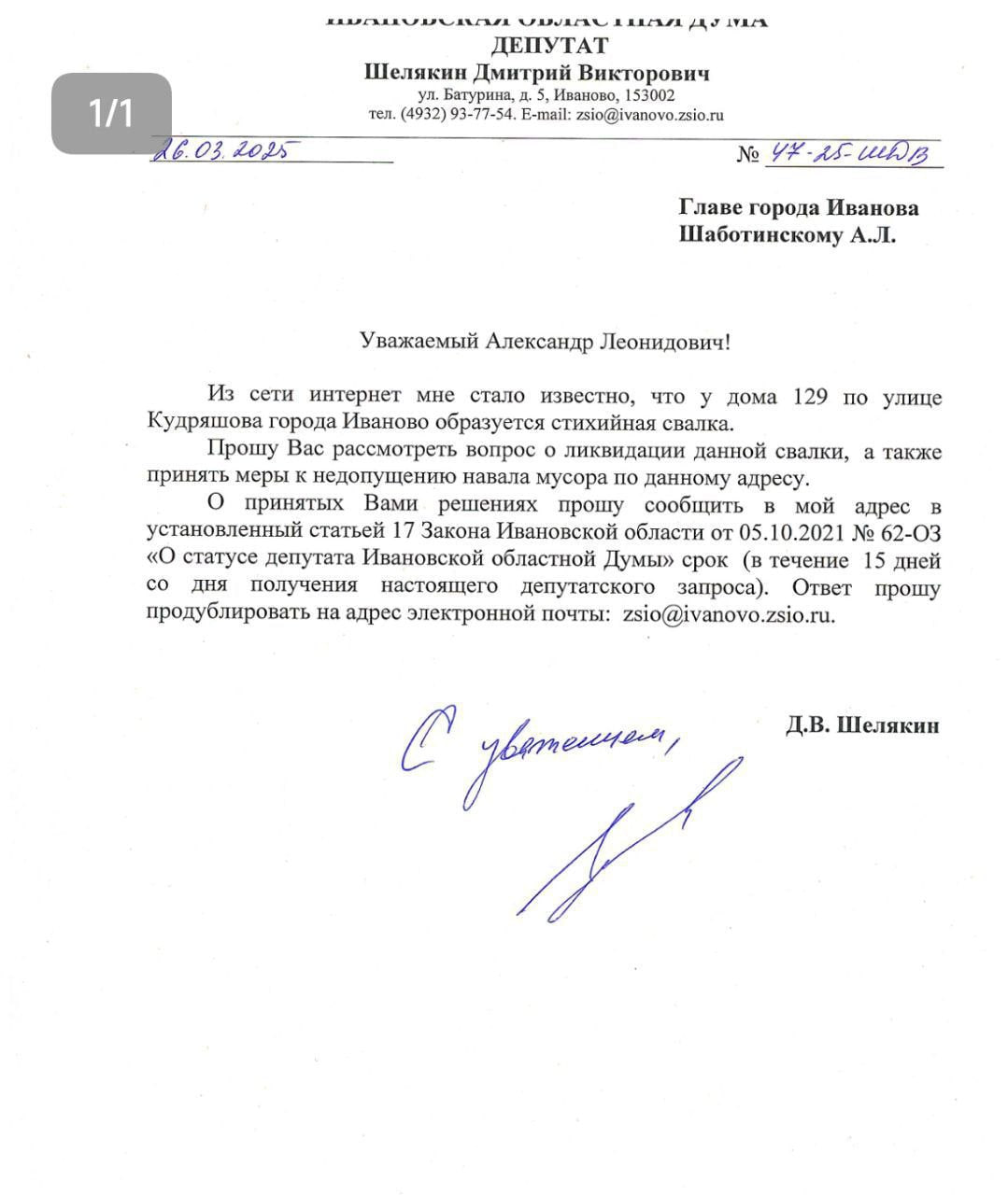 Депутат Ивановской областной Думы от ЛДПР Дмитрий Шелякин направил официальный запрос в администрацию города о ликвидации свалки, а также принятию мер к недопущению навала мусора по данному адресу.