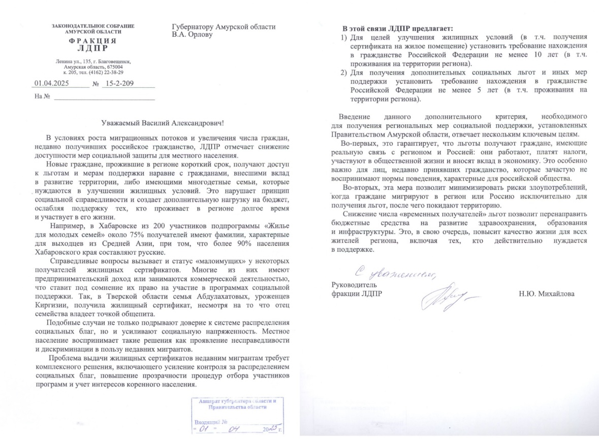 Руководитель фракции ЛДПР в Законодательном Собрании Приамурья Наталья Михайлова, исполняя поручение Председателя партии ЛДПР Леонида Слуцкого (https://vk.com/wall533756749_25964) , направила обращение на имя Губернатора области.