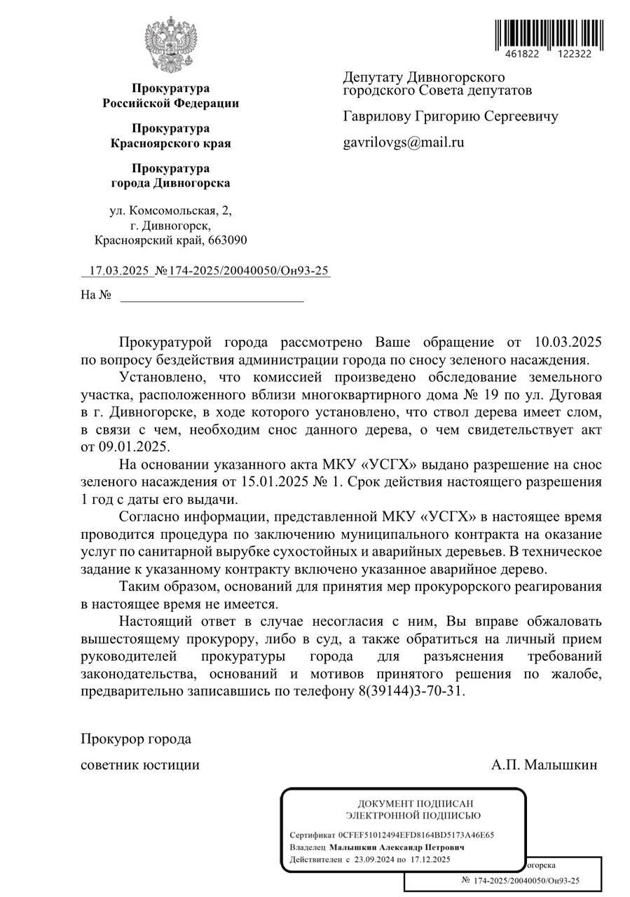 На поступившую жалобу депутат ЛДПР Григорий Гаврилов направил запрос в прокуратуру. Сегодня заявители сообщили, что дерево наконец-то убрали.