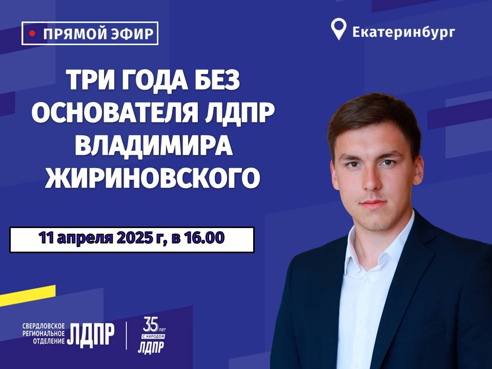 11 апреля в штабе Свердловского регионального отделения ЛДПР на онлайн-площадке VK состоится прямой эфир на тему: «Три года без Основателя ЛДПР Владимира Жириновского». Проведет эфир и ответит на ваши вопросы помощник координатора Свердловского регионального отделения ЛДПР по работе с молодежью Данил Кулаков