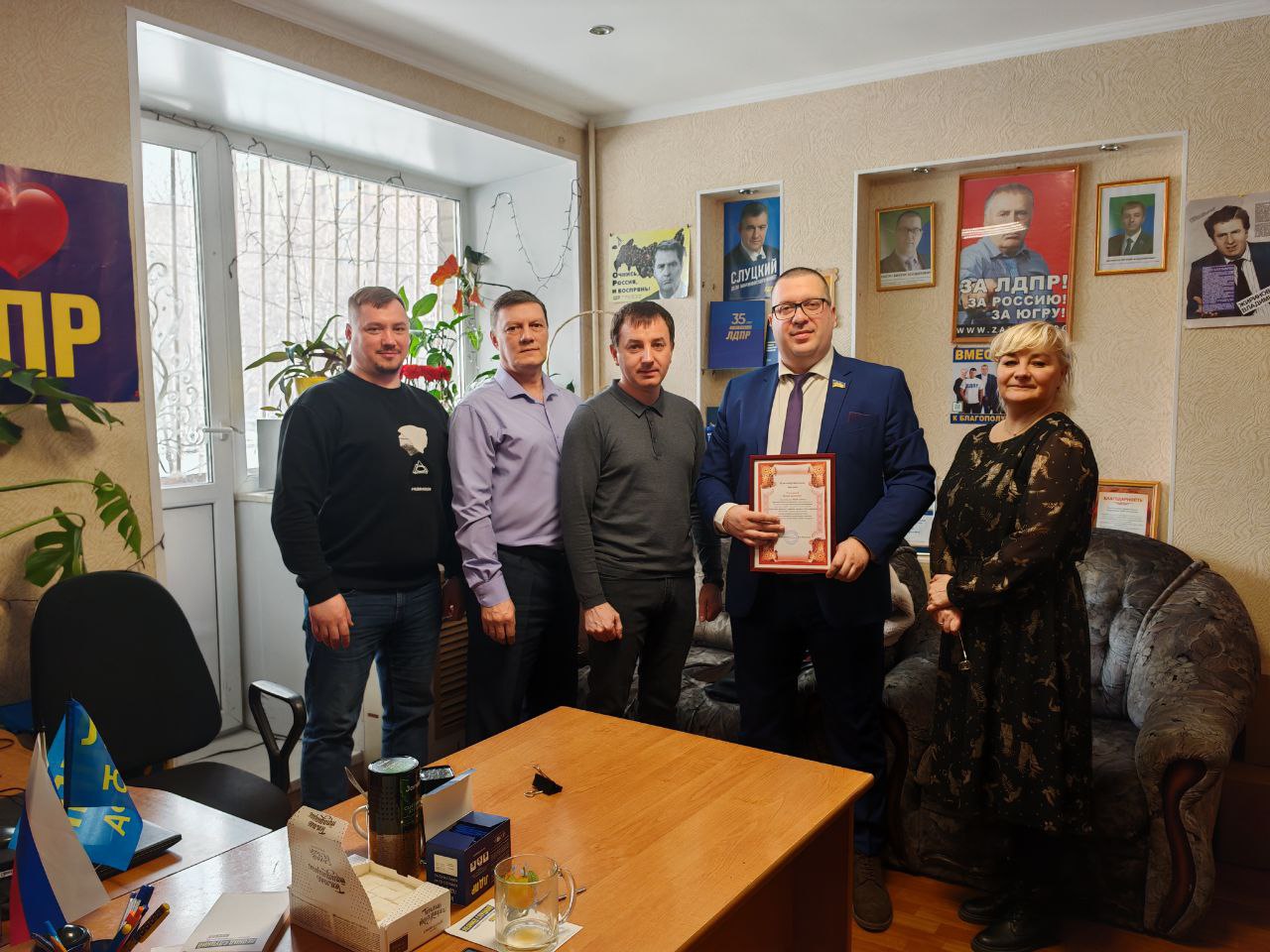 Партийцы вручили депутату ЛДПР Виктору Сысуну благодарственного письма от родителей, учеников и руководства школы №12 за оказанную финансовую поддержку учреждению и внимание к образовательным темам и нуждам.