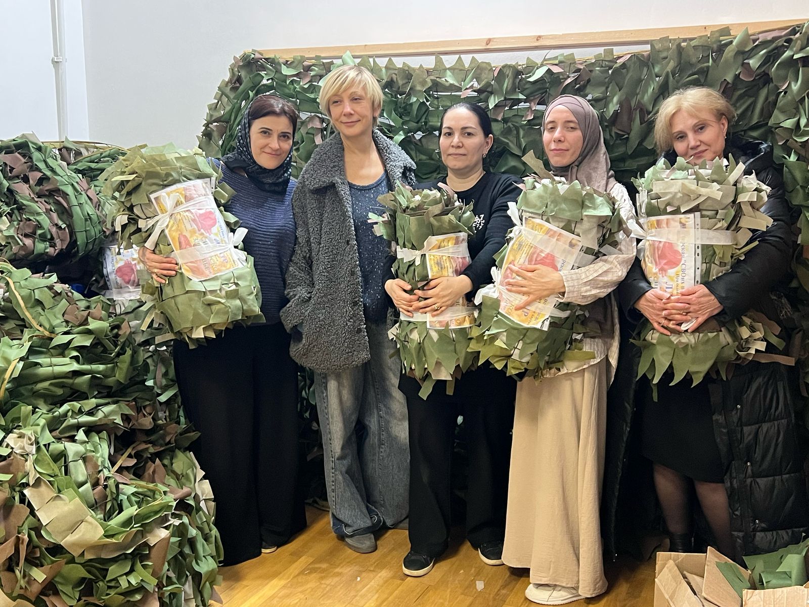 Всю ночь бригада из 11 женщин - волонтеров ЛДПР, оставив дома свои семьи, мужей и детей, работала над сетями. Утром 10 маскировочных сетей были сплетены, упакованы и готовы к отправке.